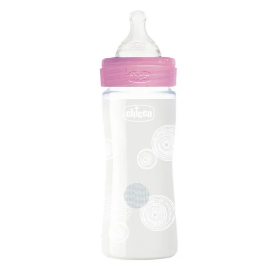 Biberonul Chicco Well Being Bottle Glass de 240 ml, cu flux lent, pentru vârsta de peste 0 luni, în culoarea roz, este o sticlă ergonomică care facilitează hrănirea atât pentru părinți, cât și pentru bebeluși.