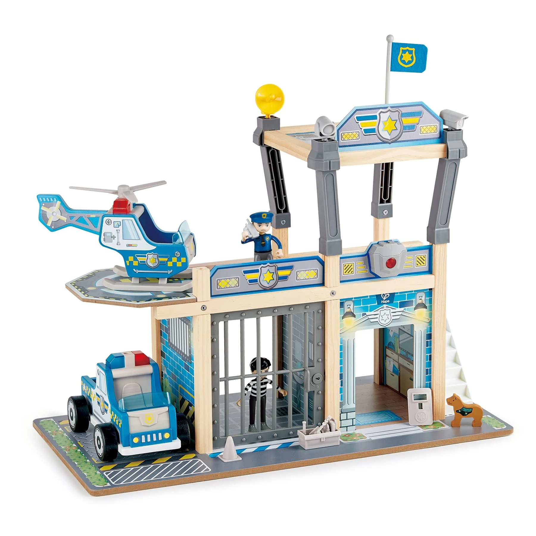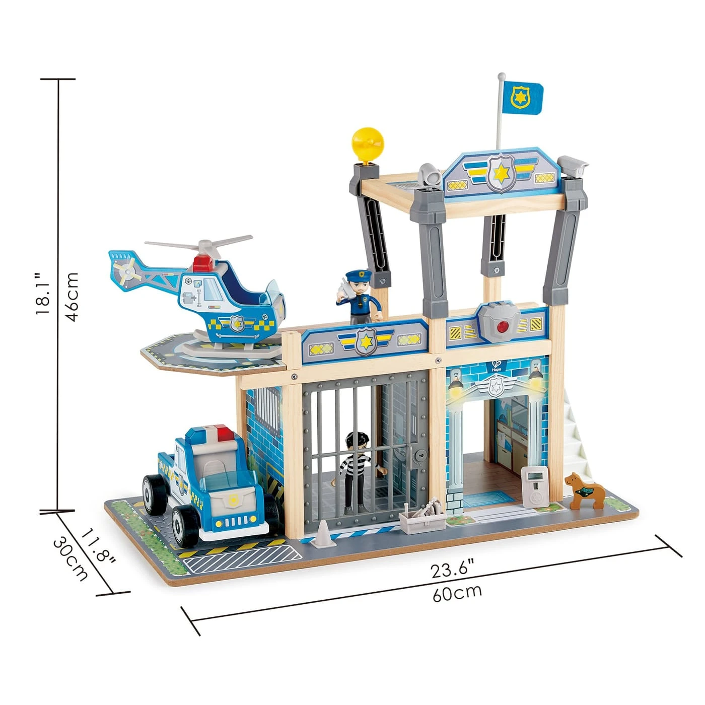 Povestește-ți propria poveste despre polițiști și hoți cu acest set fantastic de stație de poliție! Stația cu două nivele include o celulă de închisoare cu ușă care se deschide, un birou, un elicopter cu propriul său heliport, o mașină de poliție cu loc de parcare, un polițist, un deținut și o mulțime de accesorii pentru echipamentul poliției - chiar și un câine polițist!
