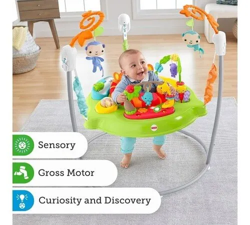Copilul va iubi cu siguranță săritorii Rainforest, pentru că sunt atât de distractivi. Muzica, efectele de iluminare și sunetele emoționante încurajează copilul dvs. să se miște și să sară activ. Scaunul, care se rotește cu 360 de grade, îi va permite tânărului explorator să exploreze toate jucăriile (maimuțe moi deasupra capului, dinți, zgârieturi, oglindă etc.). Jocul distractiv continuă chiar și atunci când copilul este în creștere, pentru că jumperii au trei nivele de reglare a înălțimii.