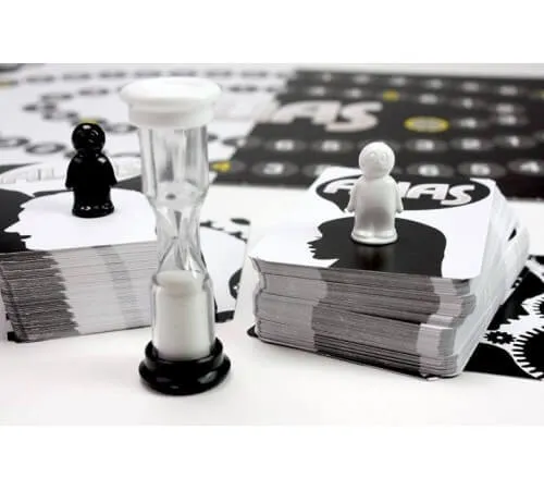 Într-un set: 400 de cărți cu 2400 de cuvinte, un teren de joc, o clepsidră, 2 cifre.