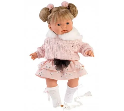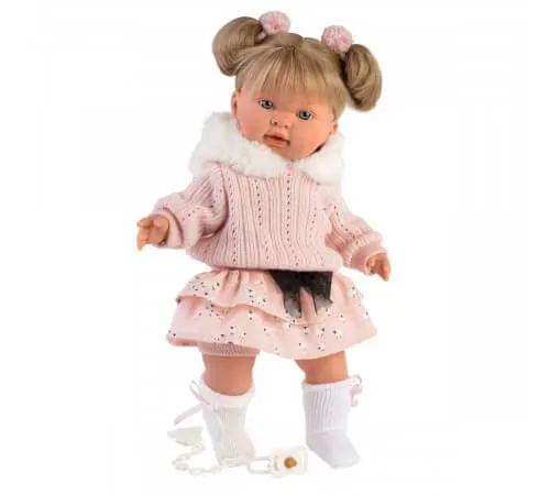 Păpușa interactivă Alexandra Llorona - cea mai recentă colecție a mărcii spaniole Llorens. Alexandra este îmbrăcată într-o frumoasă rochie roz cu miei, un pulover roz cu guler de blană, pantaloni scurți roz și șosete albe pe genunchi. Păpușa are o față frumoasă, ochi albaștrii și păr blond. Burtica păpușii este umplută cu umplutură moale, ceea ce o face ideală pentru îmbrățișări. Păpușa are o suzeta atașata la bandă, care îndeplinește o funcție importantă. Dacă luați suzeta de la păpușa, ea va plânge și își va chema mama și tata ca un copil adevărat. Păpușa este ambalată într-o cutie de carton decorativă. Ne plac papusile spaniole Llorens!