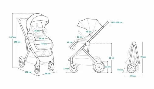 Caruciorul este echipat cu un cadru usor din aluminiu. Cadrul împreună cu scaunul pot fi pliate cu ușurință la dimensiuni compacte, iar pătuțul în poziție plată. Riya 2 în 1 are un sistem dublu de pliere și blocare automată a plierii. Setul include adaptoare universale pentru ajustarea cadrului la instalarea scaunelor de siguranță pentru copii.