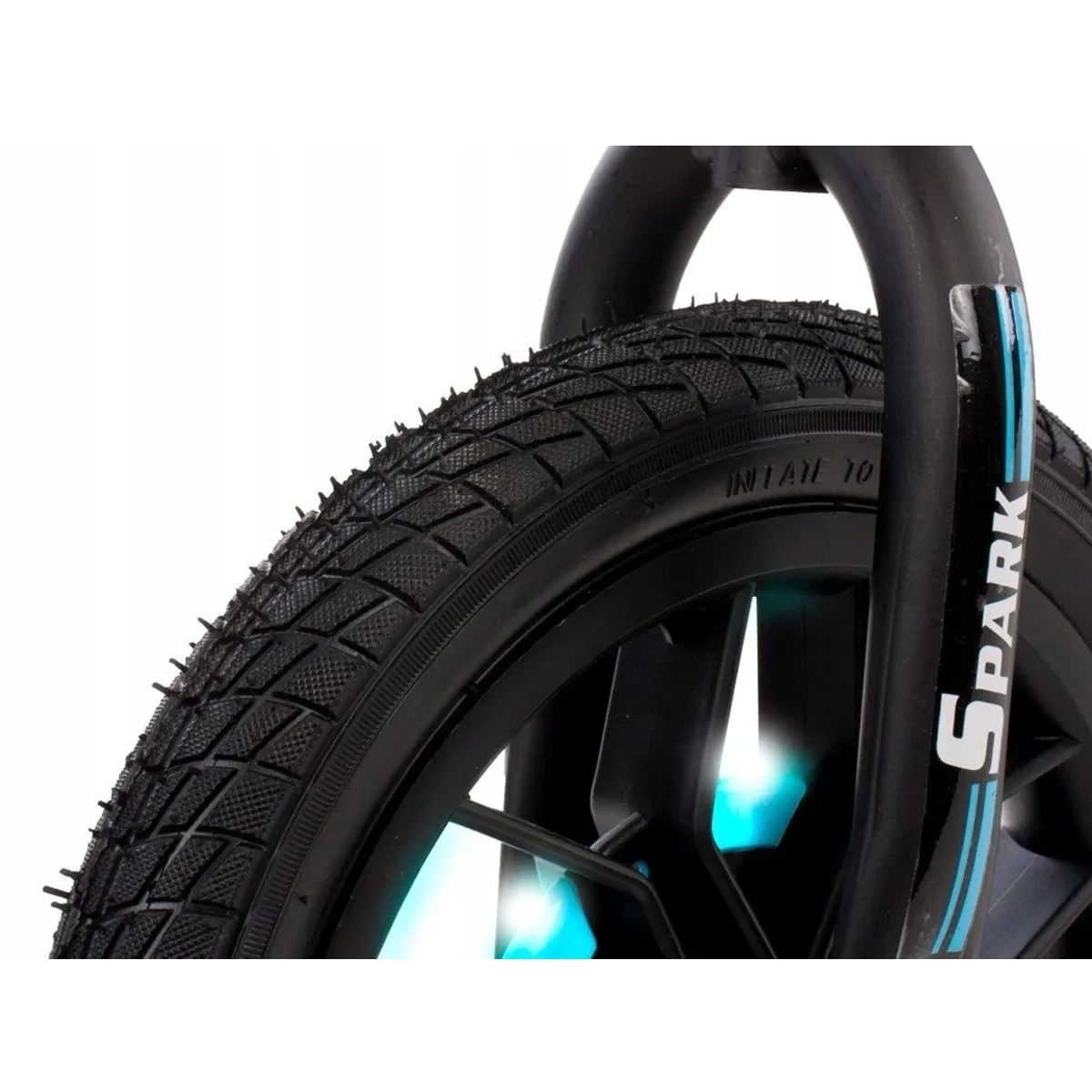 - Roțile au diametrul de 12 inch și sunt acoperite cu cauciuc, cu un umplutură specială în interior care imită presiunea corectă în roată, fără a necesita umflare.