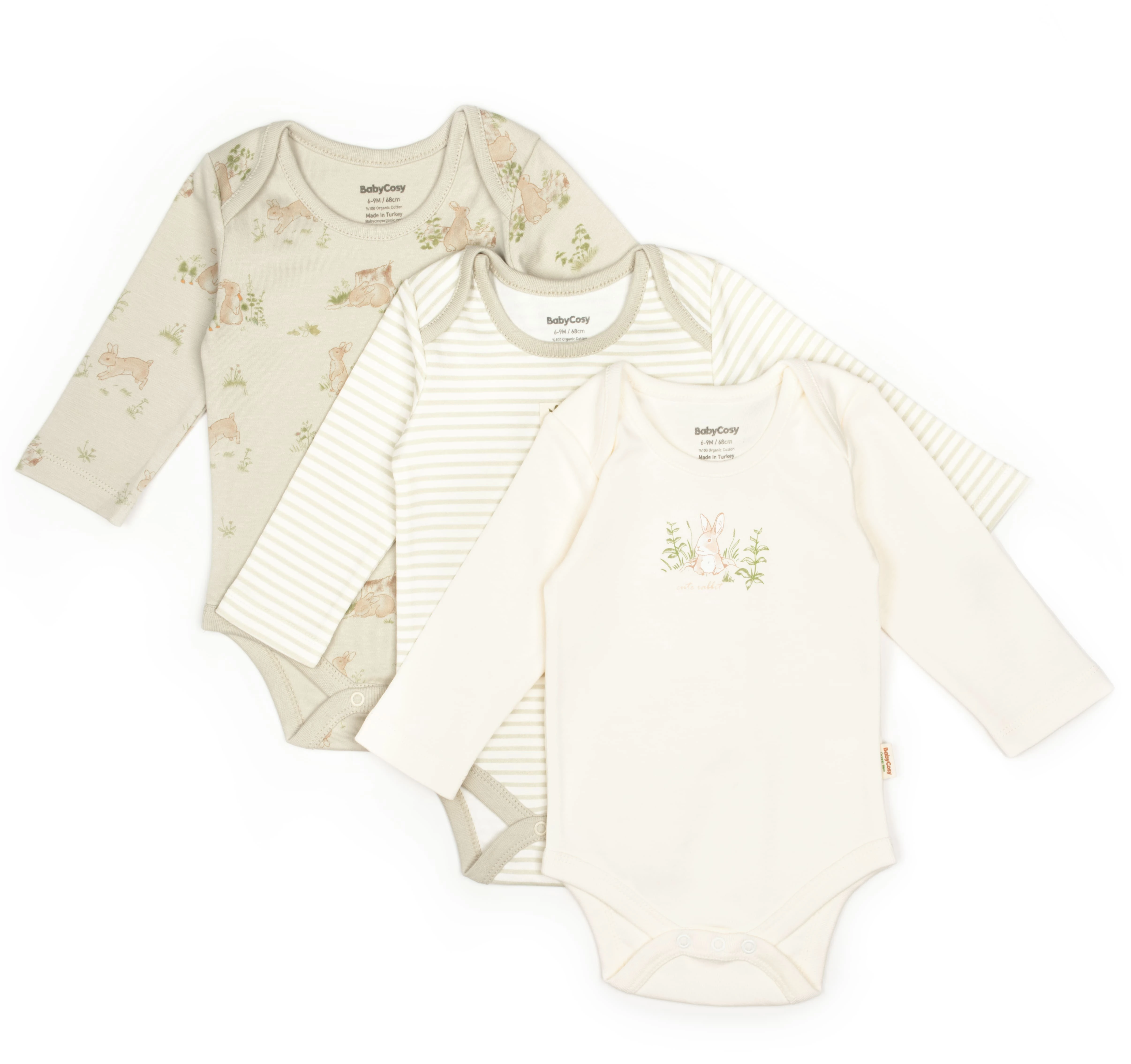 Body cu mâneca lungă BabyCosy Rabbit Ecru & Soft Green, 3 buc. (6-9L)