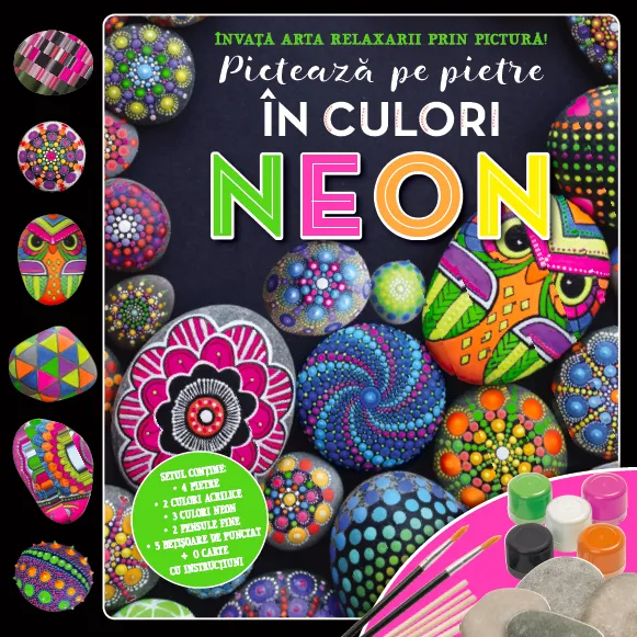 Ideal pentru cei pasionati de indeletniciri artistice creative, acest mic manual de pictura pe pietre te invata cum sa creezi adevarate opere de arta tridimensionale, pline de viata si de culoare, care-ti pot infrumuseta casa ori gradina sau pot deveni cadouri inedite pentru cei dragi . Autoarea Katie Cameron a adunat in carte opt modele de pictura in culori neon, de la hipnotica Piatra Infinita la simpatica Mica Bufnita morocanoasa.