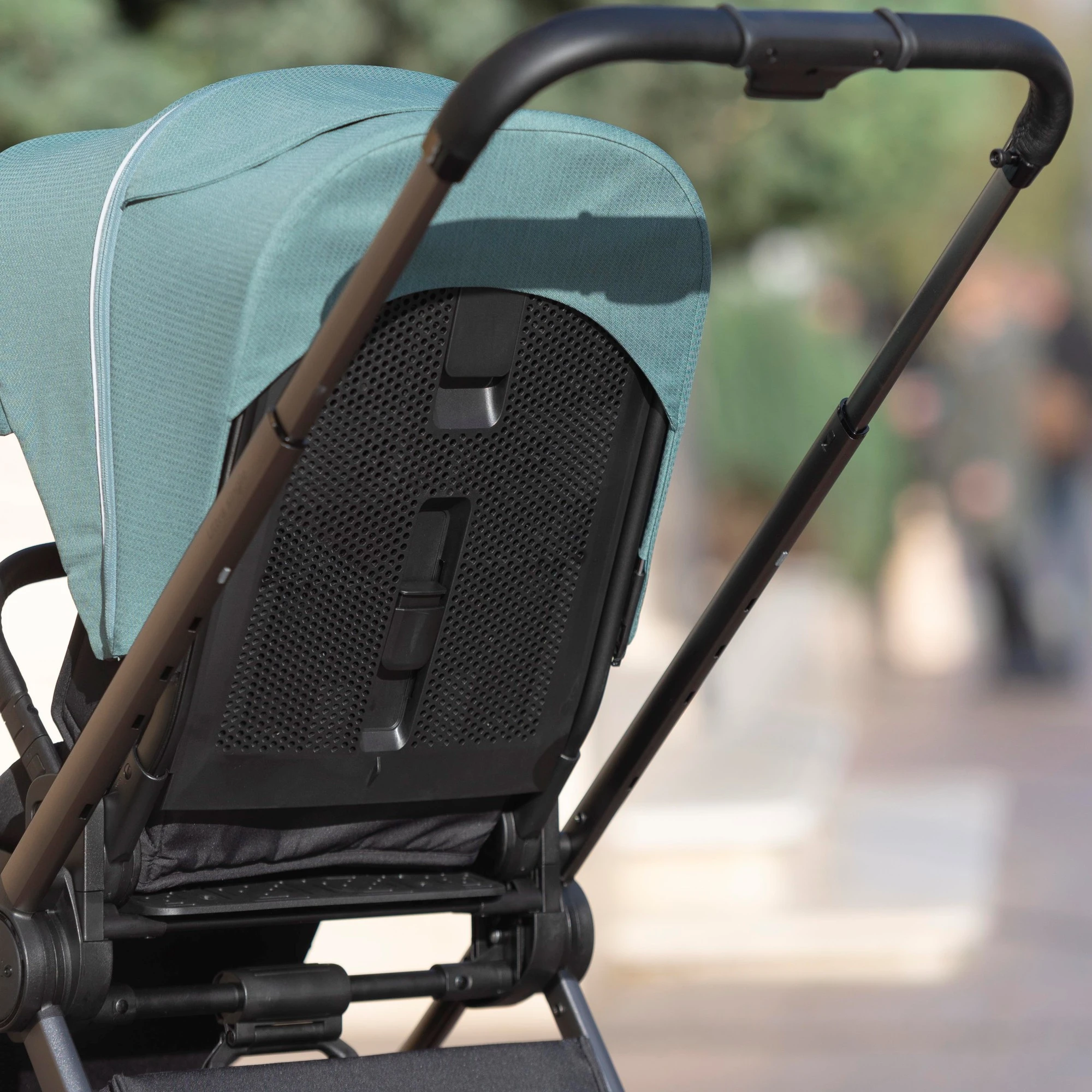 Capota blocului de plimbare își schimbă înălțimea și se fixează într-una din cele trei poziții. Butonul de fixare a pozițiilor capotei este situat pe partea exterioară a spătarului. Spătarul este realizat din plastic rezistent și hipoalergenic, cu funcție de ventilație.