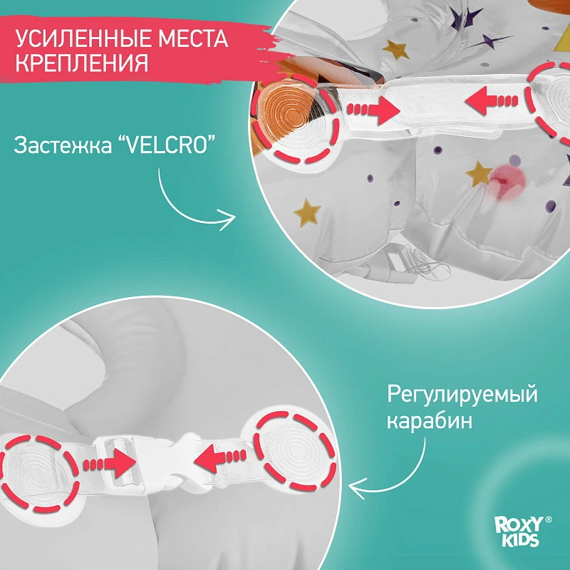 Părinților le va plăcea, deoarece nu este nevoie să stea permanent în poziție îndoită. Fixarea sigură se realizează prin două velcro reglabile și un carabinier, iar punctele de prindere sunt consolidate suplimentar. Cusătura interioară moale nu freacă gâtul, iar decupajul anatomic pentru bărbie fixează confortabil capul copilului.