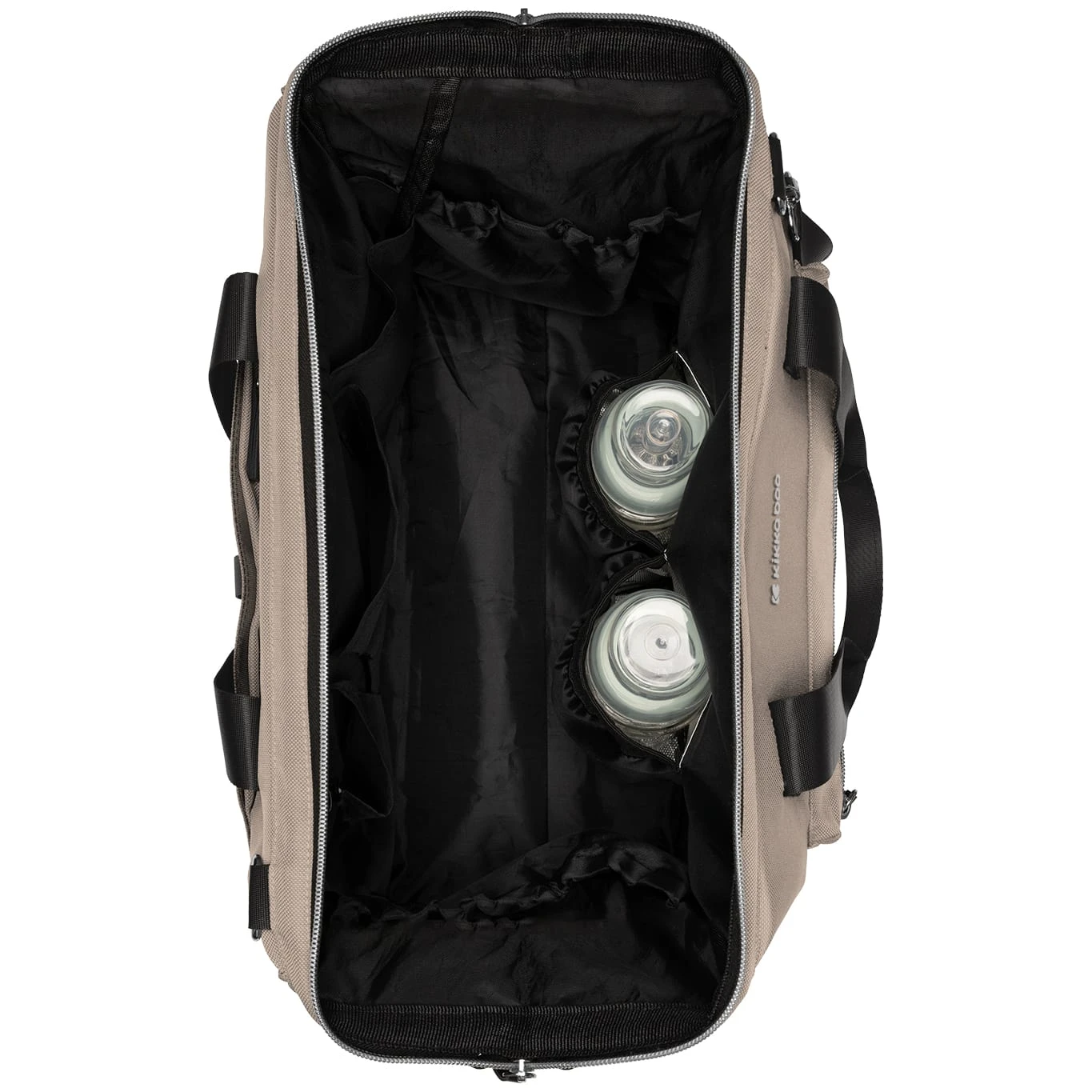 - Geanta include un buzunar rezistent la apă pentru articole umede și două compartimente izolate pentru biberoane, care mențin temperatura apei sau a laptelui timp de ore întregi, pentru ca esențialele să fie mereu la îndemână și în siguranță.
