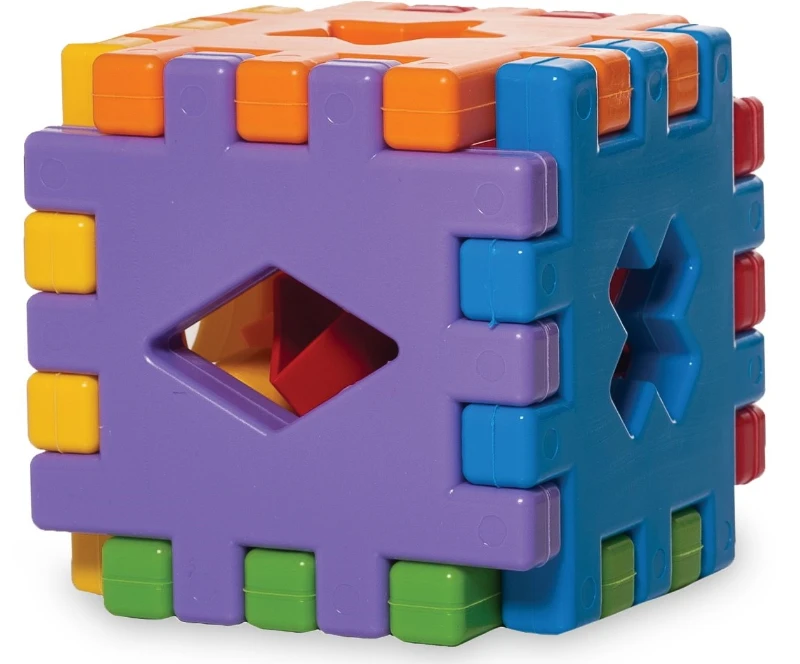 Fiecare față a cubului conține o gaură în formă geometrică, iar copilul trebuie să potrivească figurina corespunzătoare. Setul include 6 forme geometrice colorate, fiecare cu o formă diferită. Astfel, copilul învață să recunoască formele și culorile, să observe diferențele, dezvoltând memoria, logica, coordonarea și dexteritatea.