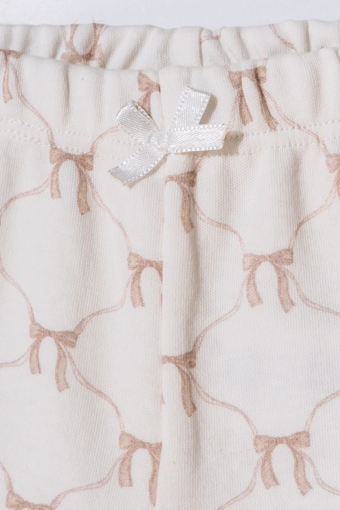 Set de 2 pantaloni confortabili pentru bebeluși, ideali pentru purtat acasă sau la plimbări. Unul dintre pantaloni are imprimeu cu desene de bentițe, iar celălalt este într-o nuanță simplă. Ambele modele sunt prevăzute cu botoșei și talie elastică pentru confort maxim.