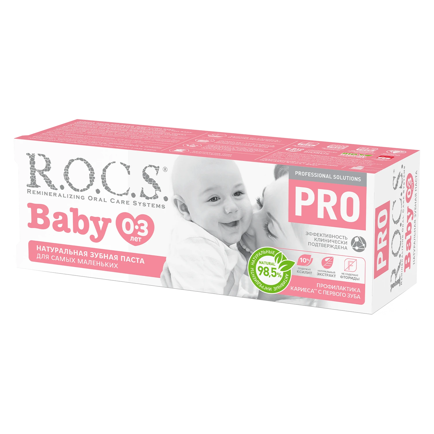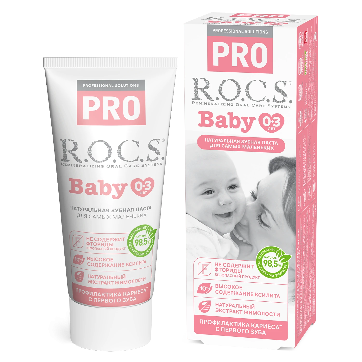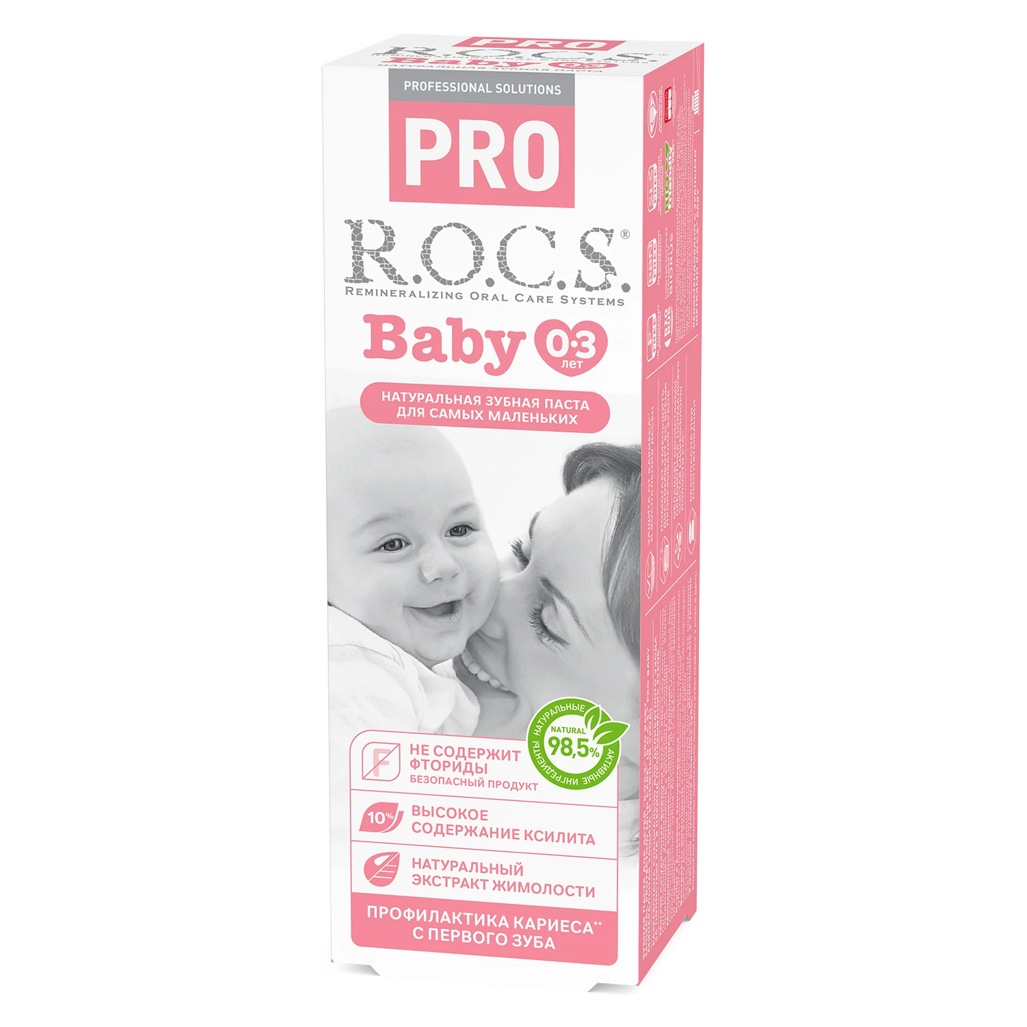 R.O.C.S. PRO Baby este special concepută pentru îngrijirea zilnică a dinților bebelușilor începând de la o vârstă fragedă — de la 0 la 3 ani, mai ales în situațiile în care bebelușul are nevoie de remineralizare și protecție intensificată a dinților. Oferă o curățare de calitate, fără a afecta smalțul delicat al dinților de lapte. Protejează eficient împotriva cariilor și normalizează microflora cavității bucale. De asemenea, combate inflamațiile gingiilor în perioada erupției dentare. Este sigură în cazul înghițirii accidentale.