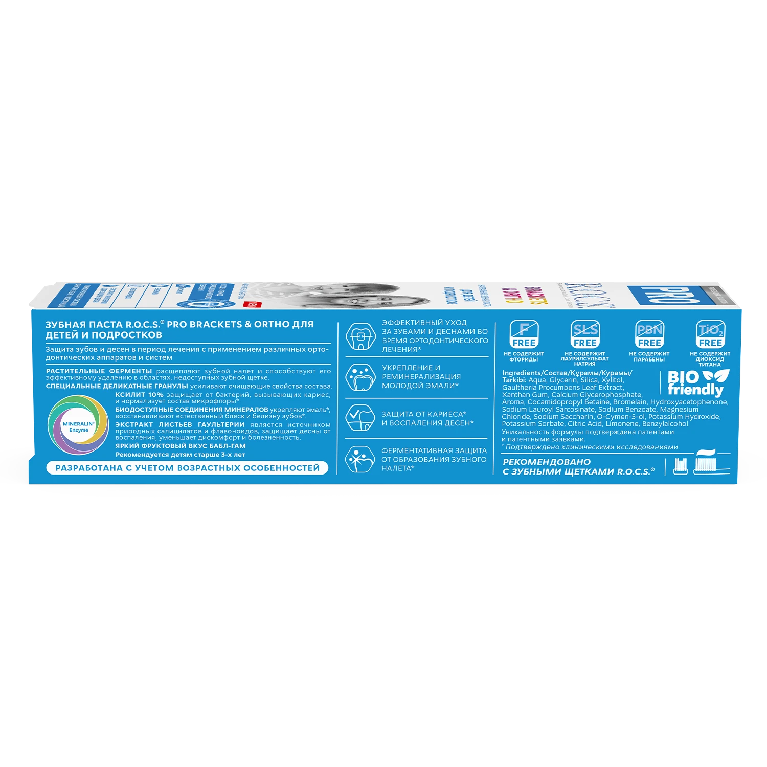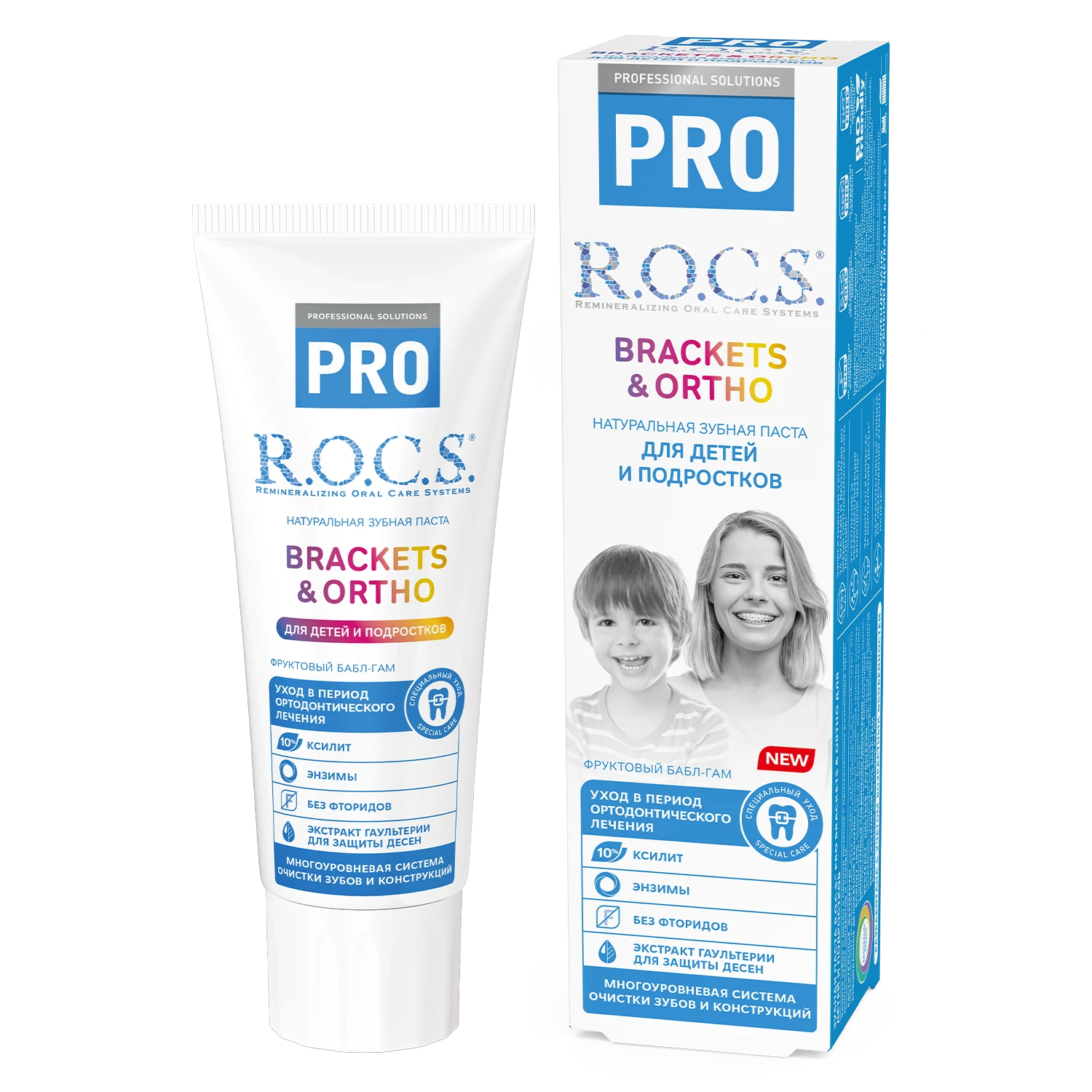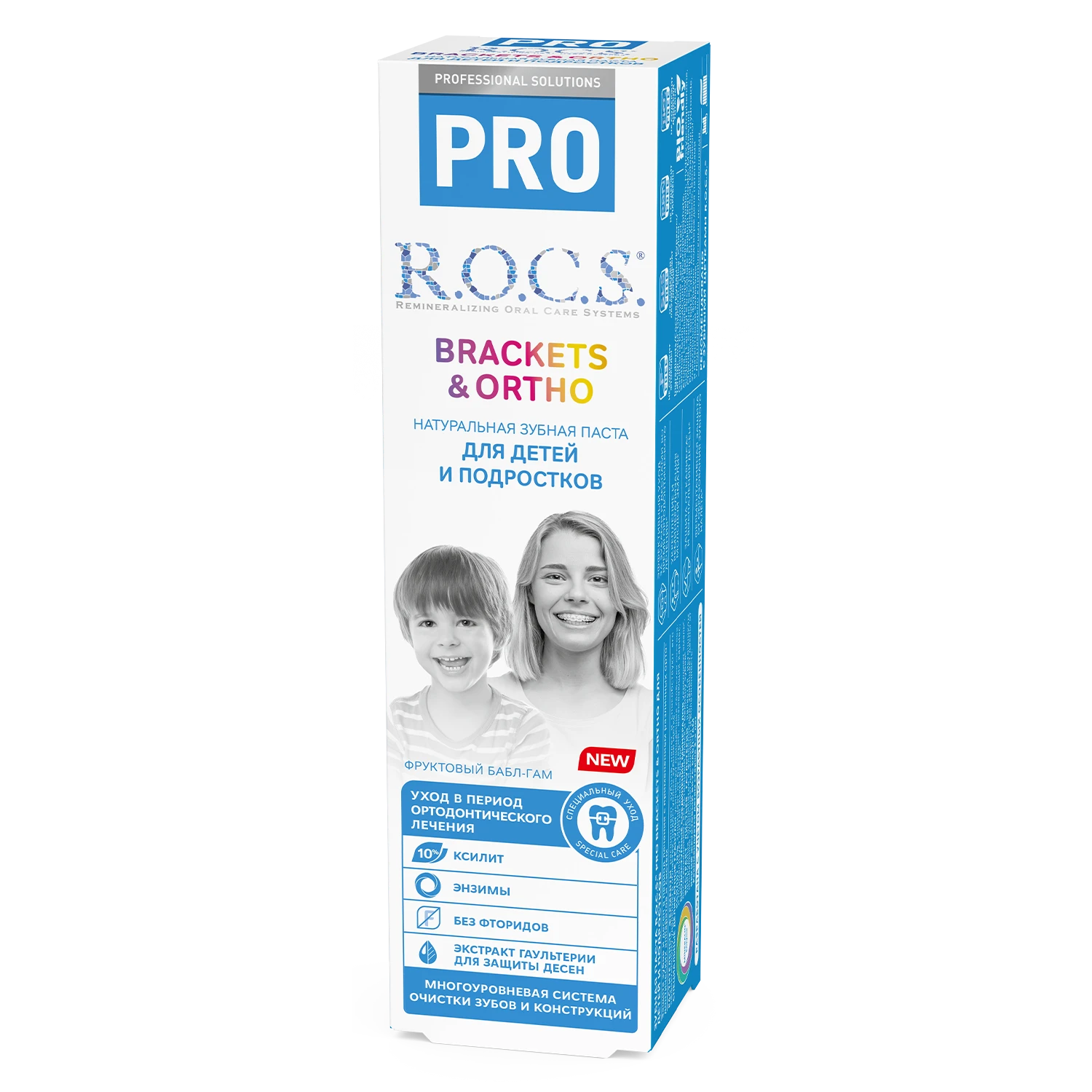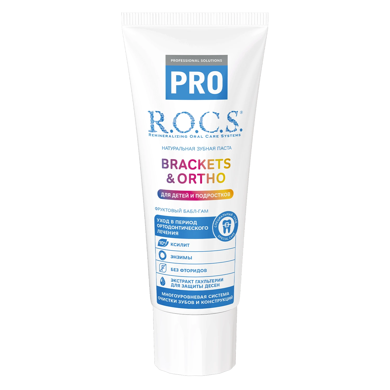 Este creată pentru îngrijirea eficientă a dinților copiilor și adolescenților care poartă sisteme de aparat dentar și construcții ortodontice. Sistemul de curățare enzimatică înmoaie placa dentară din zonele greu accesibile și contribuie la eliminarea acesteia. Complexul remineralizant al pastei întărește smalțul și crește rezistența acestuia la carii. Pasta are un efect direct antiinflamator, ceea ce este deosebit de important atunci când se activează sistemele de aparat dentar. Aroma fructată de gumă de mestecat face îngrijirea cavității bucale mai plăcută pentru copii. R.O.C.S. — gustul strălucitor al unui zâmbet sănătos!