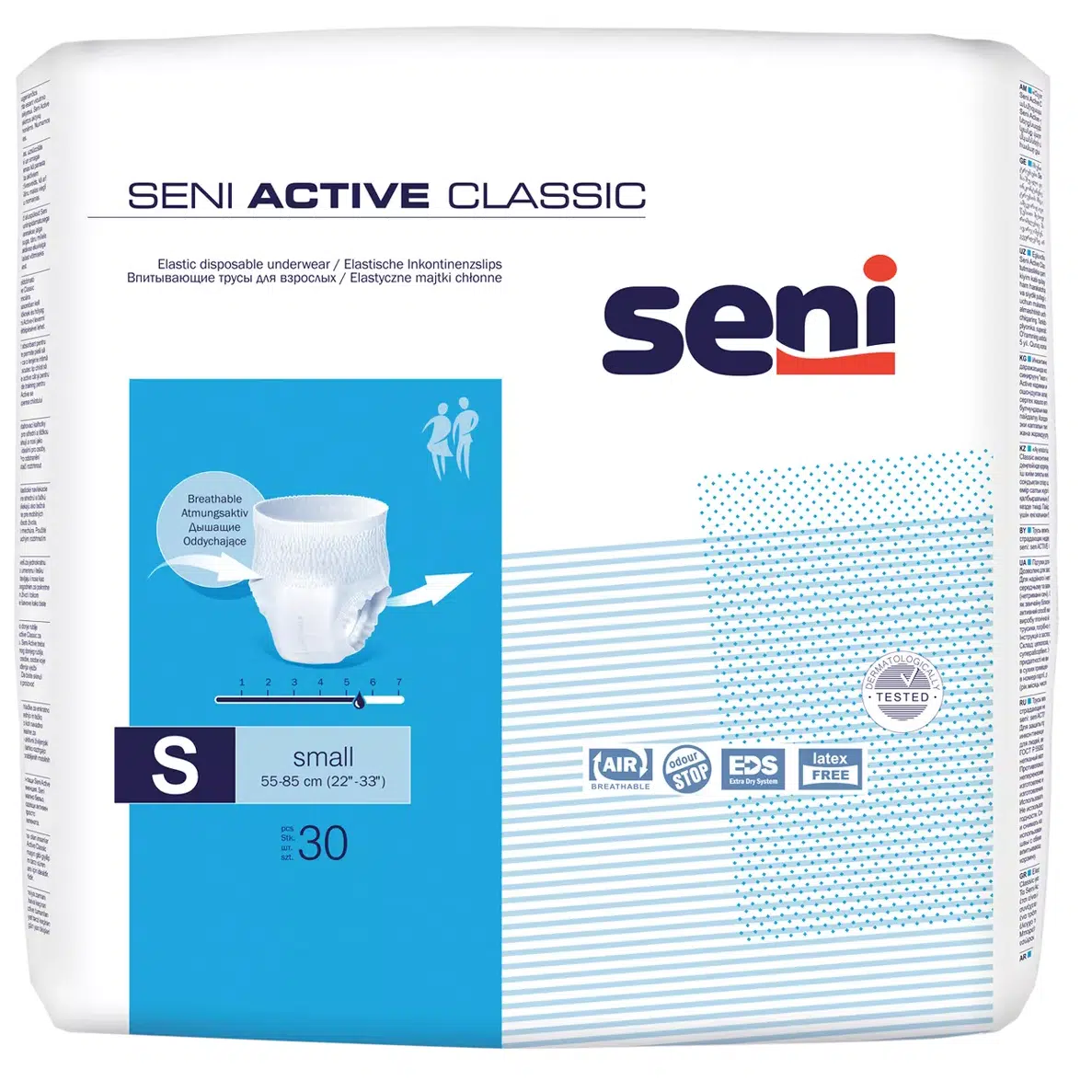 Chiloții absorbanti de unică folosință Seni Active Classic reprezintă o soluție practică pentru persoanele active care apreciază discreția și confortul. Seni Active Classic oferă protecție în caz de incontinență urinară moderată și severă. Sunt elastici și se poartă ca lenjeria intimă obișnuită. Sunt potriviți și pentru persoanele care suferă de boala Alzheimer sau alte tipuri de demență și care refuză scutecul. Sunt prevăzuți cu bariere laterale și tehnologia Extra Dry System (EDS), care oferă protecție eficientă împotriva scurgerilor.