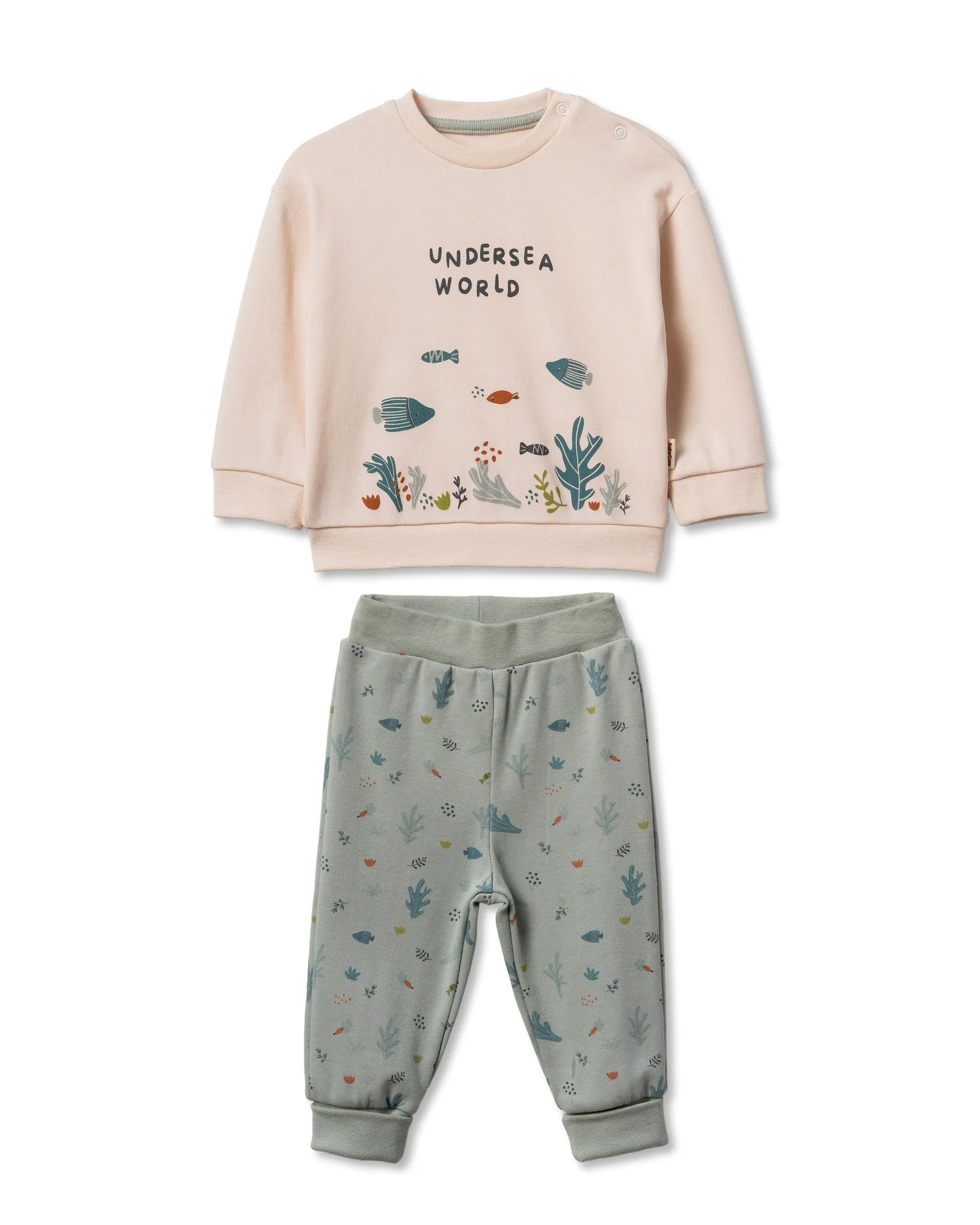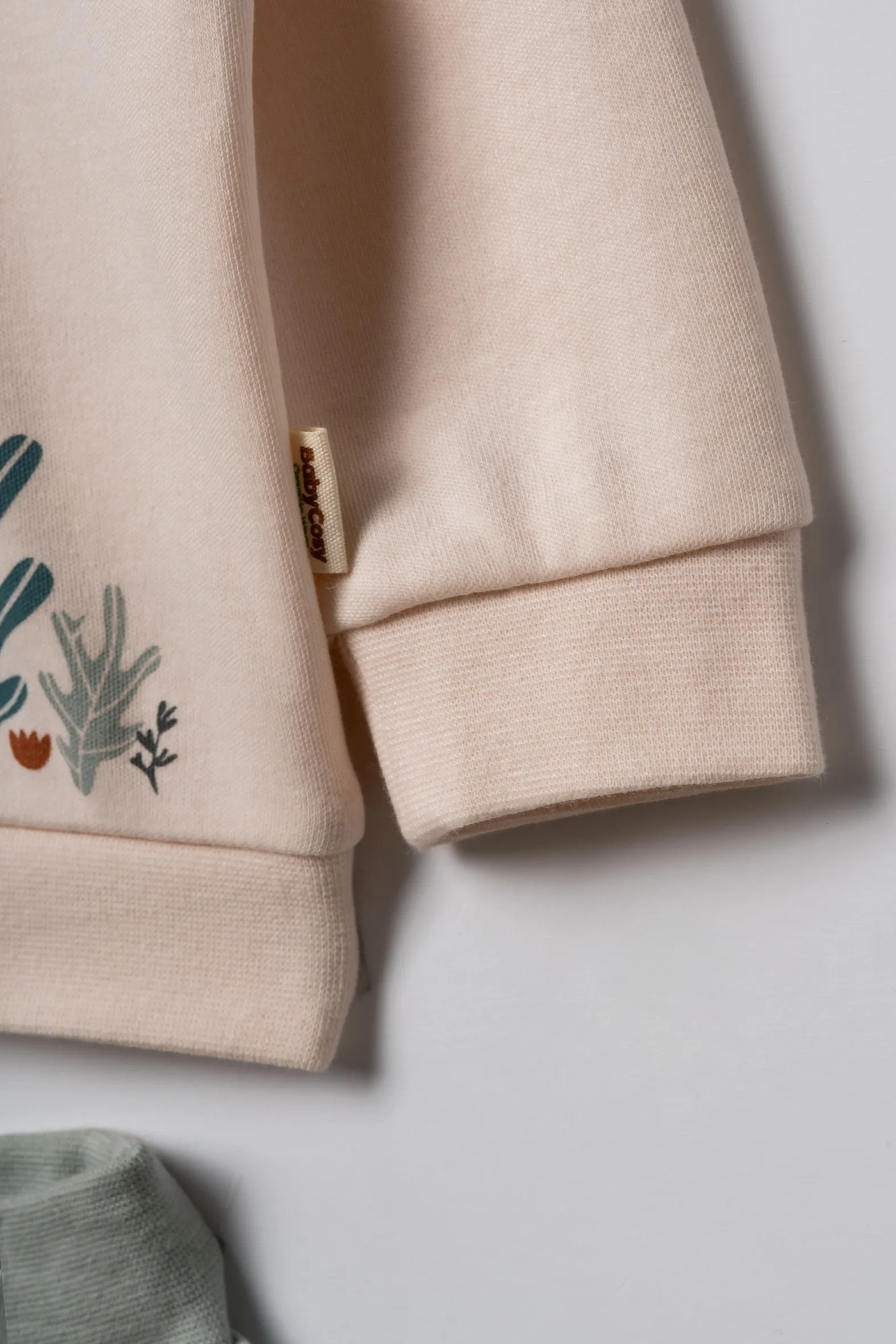 Setul BabyCosy Green & Ecru este un комплект confortabil și practic pentru bebeluși, ideal pentru purtare zilnică. Combinația dintre bluza bej și pantalonii verzi cu tematică marină oferă un aspect vesel și modern.