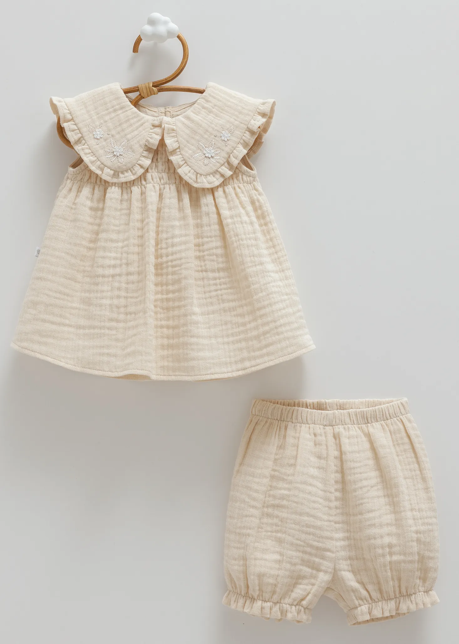 Setul Caramell Smile Beige pentru fete include o bluză fără mâneci cu volănașe și șorti cu talie și piciorușe elastice, oferind confort și libertate de mișcare micuței tale. Designul delicat și feminin este ideal pentru zilele calde și pentru un look adorabil de zi cu zi.