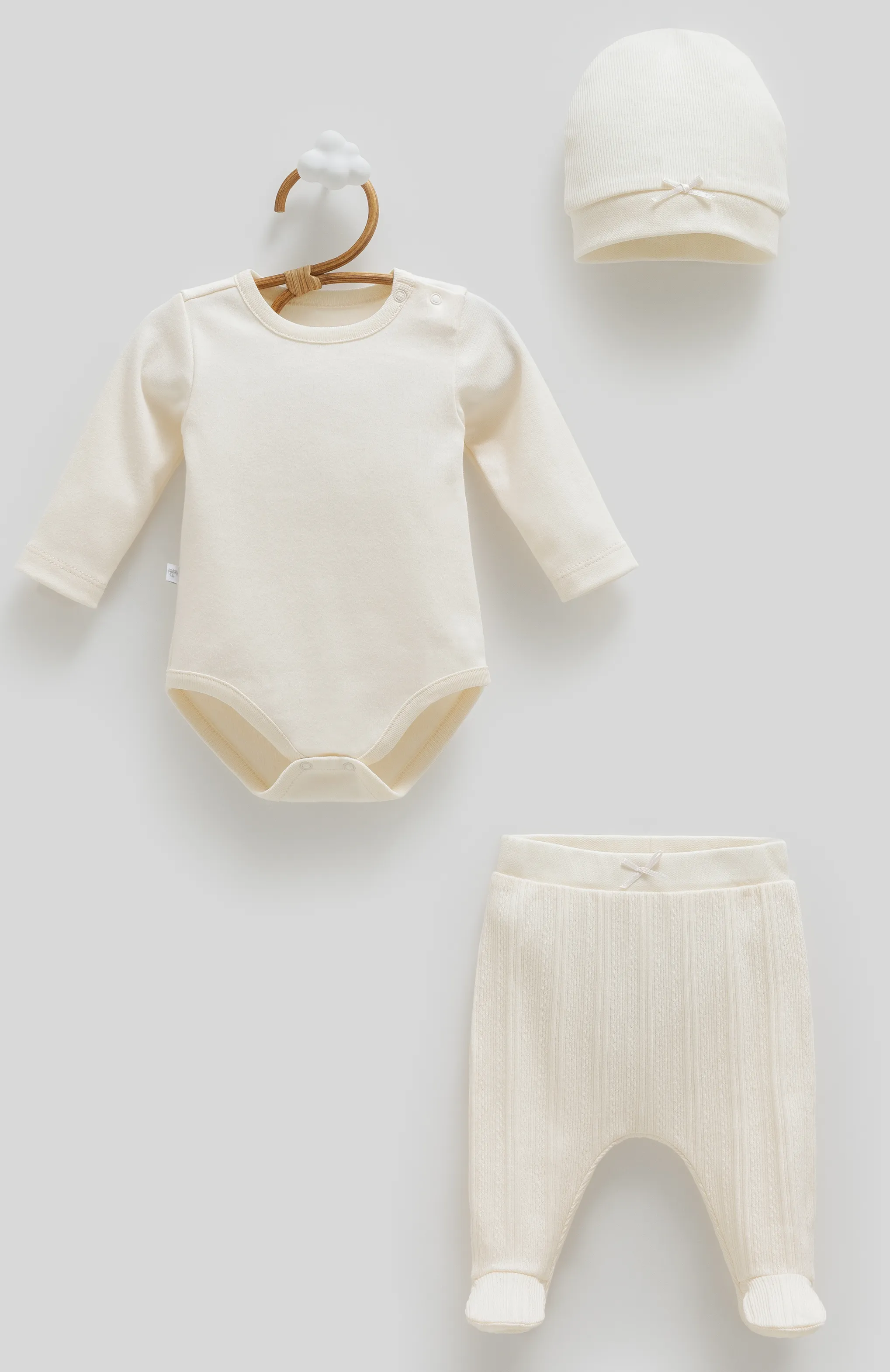 - Tip produs: set 3 piese pentru bebeluși (pantaloni + body + căciuliță)