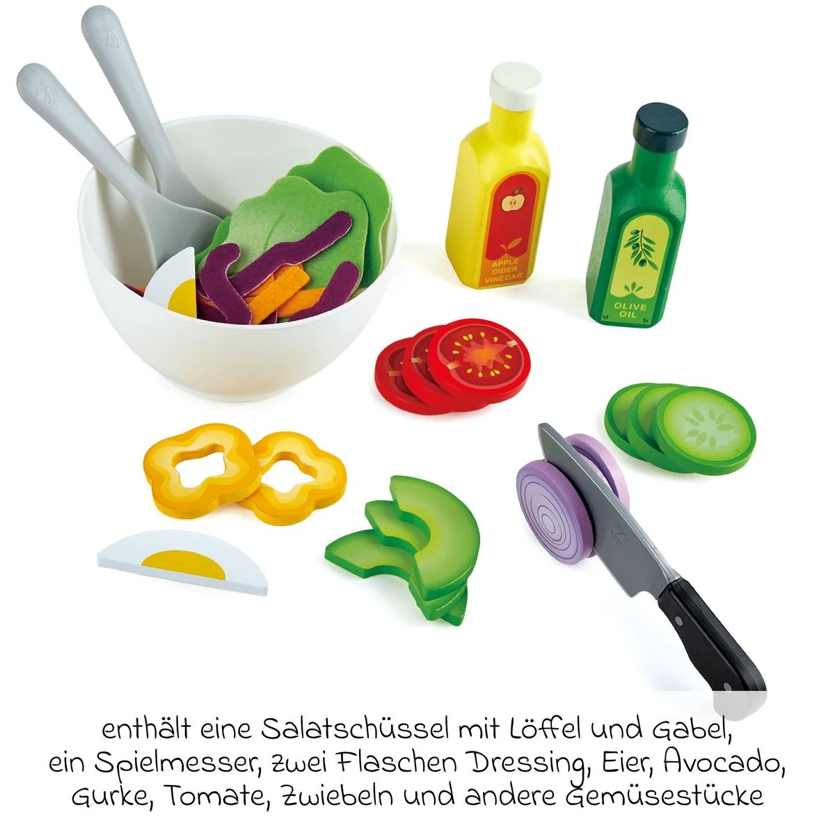 Setul de salată de la Hape este un element indispensabil în orice bucătărie de jucărie bine organizată. Cei mici pot pregăti o salată sănătoasă, tăind roșii, castraveți și ceapă cu cuțitul de jucărie, adăugând apoi salată verde, ardei, avocado sau ou. Pentru un gust complet, pot adăuga un dressing de oțet și ulei, iar totul se amestecă bine în bol cu lingurile speciale.