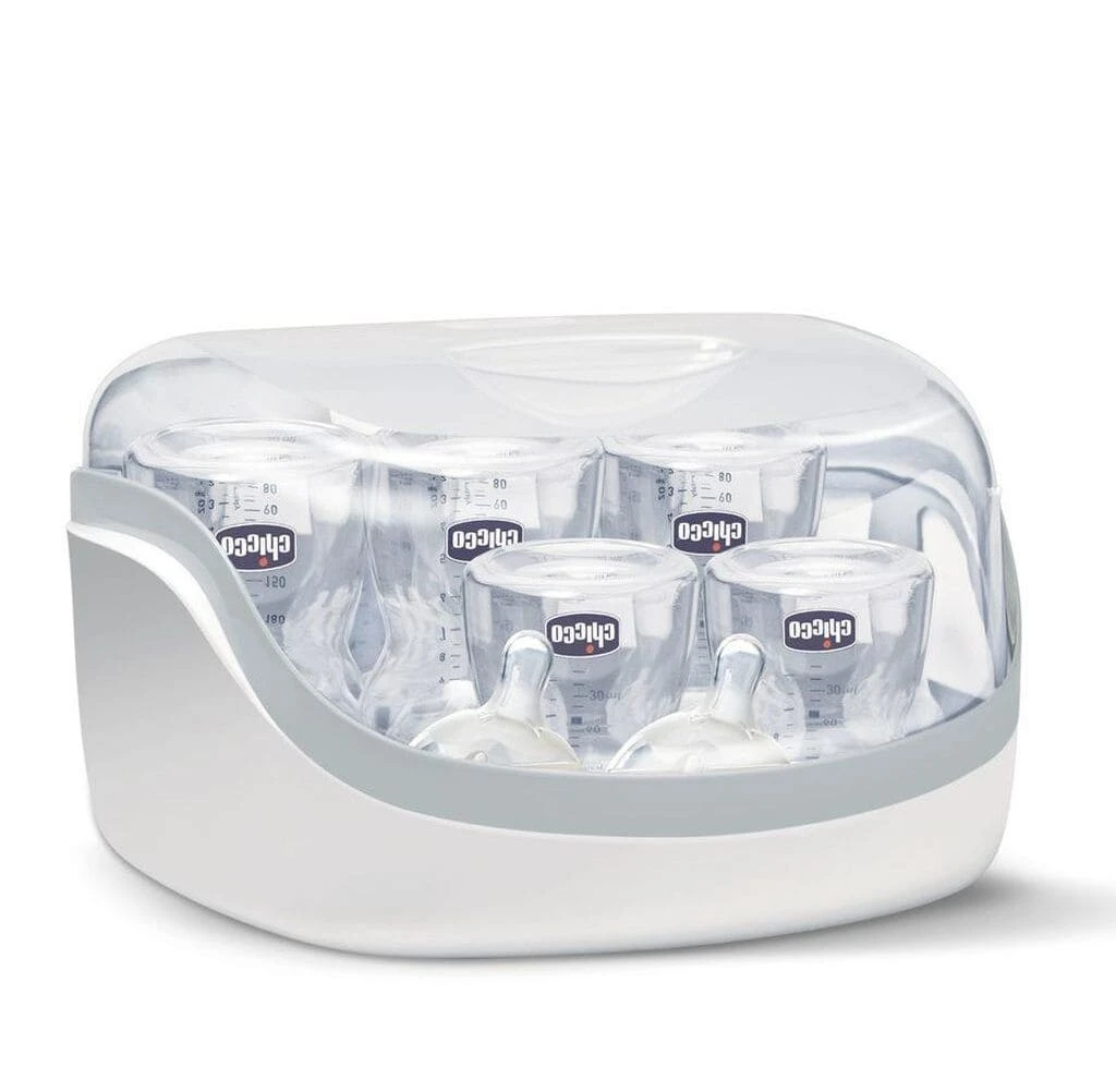 Compact și ușor, se potrivește majorității cuptoarelor cu microunde și poate conține până la 5 biberoane Chicco sau alte obiecte mici. Este echipat cu clește igienic pentru manipularea ușoară a obiectelor sterilizate.