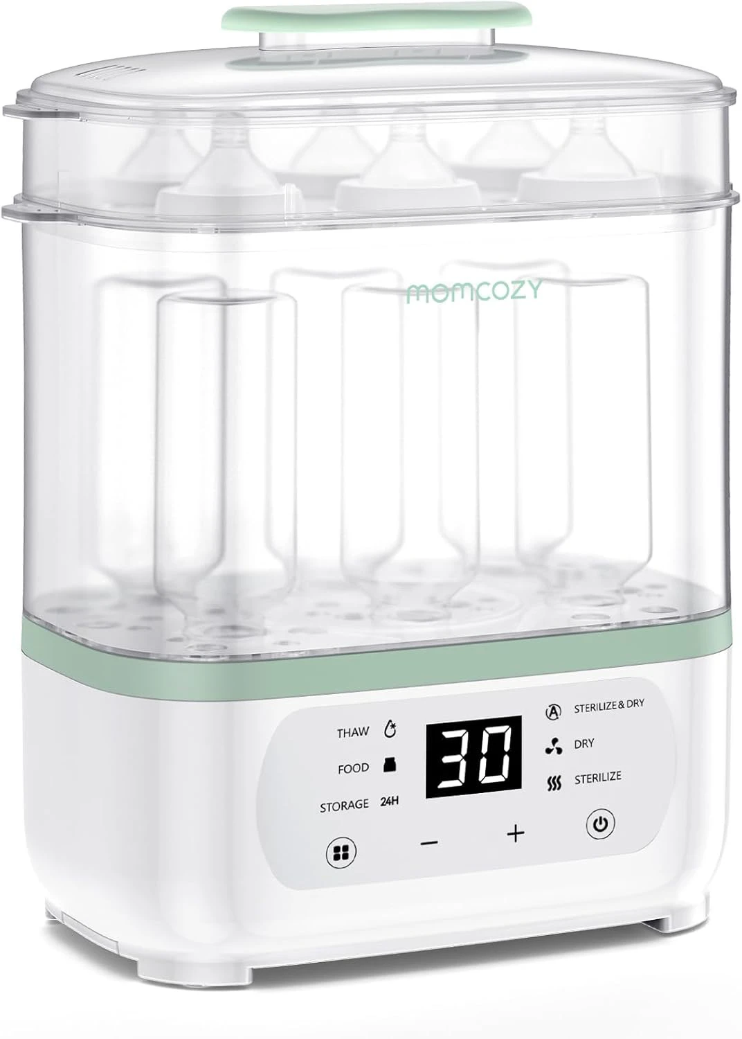 Sterilizatorul și uscătorul pentru biberoane Momcozy 8 în 1 este un dispozitiv electric multifuncțional, conceput pentru a asigura o igienă optimă a accesoriilor pentru bebeluși. Acesta combină sterilizarea cu abur și uscarea cu aer cald, eliminând eficient bacteriile și oferind siguranță maximă biberoanelor, suzetelor și accesoriilor pentru pompa de sân.