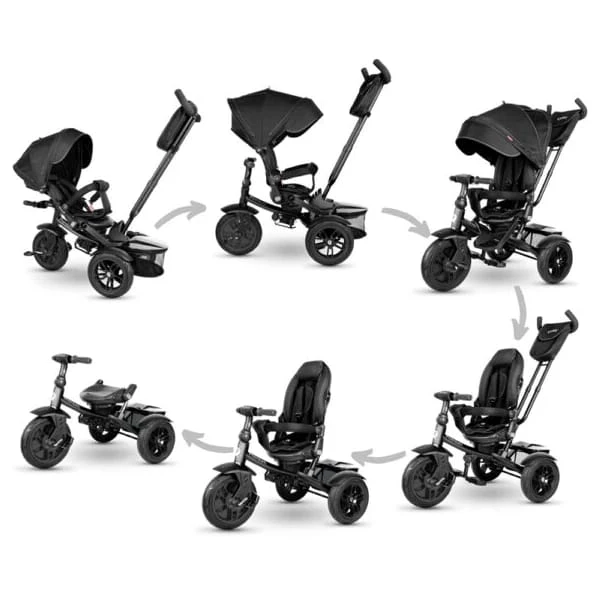 Este echipata cu un scaun pivotant si pliabil cu functii detasabile pentru a se adapta de la un carucior de bicicleta-bebelus cu siguranta si facilitati complete pentru un parinte la o tricicleta tipica.