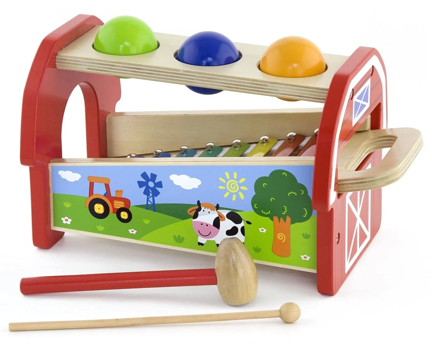 Jucăria „Xilofon cu ciocănel” este un set educativ colorat, ideal pentru cei mici. Combină două activități distractive: jocul pe xilofon și lovirea bilelor cu un ciocănel. Lovind bilele, copilul le împinge pe xilofon, producând sunete melodioase care stimulează auzul și bucuria descoperirii muzicii.