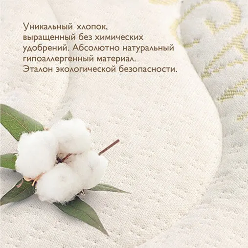 Еще одна важная особенность — стеганый чехол, поверхность которого изготовлена из органического хлопка, выращенного без использования хим. удобрений и собранного вручную. Это эталон экологичности, такой материал подойдет даже детям с аллергией.