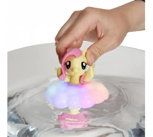 Пони умеют плавать в воде. Плавательный круг при этом переливается разноцветными огоньками. Как только игрушку вынимают из воды, световые эффекты отключаются. Снизу плавательного круга есть кнопка, которая активирует радужную подсветку.