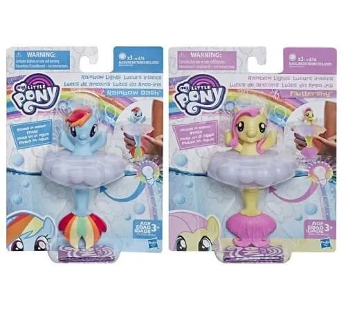 Очаровательные маленькие плавающие пони Флаттершай и Радужная Дэш с радужными кругами и хвостиками как у русалок. Игрушки выглядят как классические персонажи, высотой 12 см.
