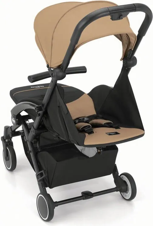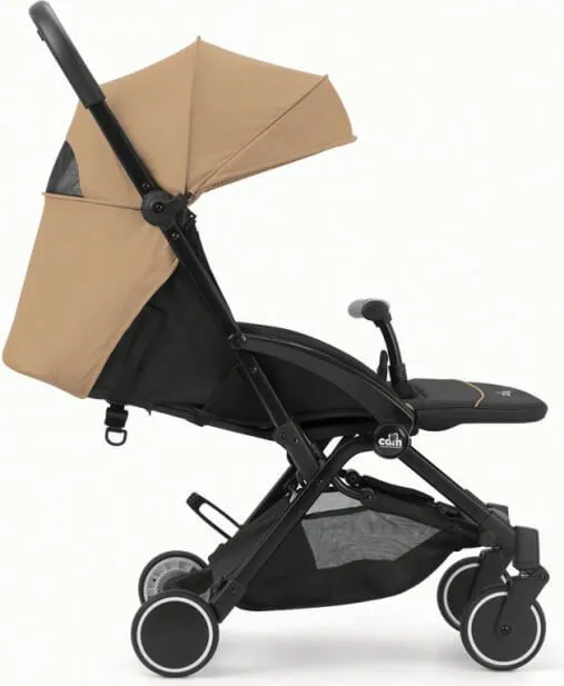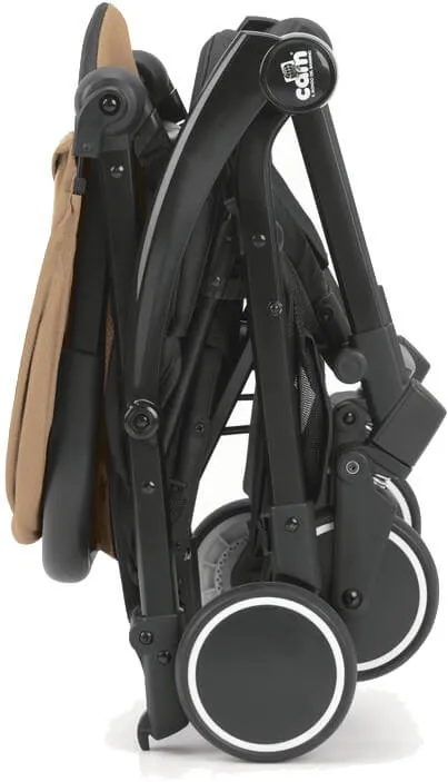 Прогулочная коляска Cam Cubo - яркая, но при этом не аляповатая, а однотонная модель, которую лёгко можно представить накинутой на плечо (как обычно носят сумку) мамы или папы с помощью специального наплечного ремня. В сложенном состоянии она всего 54 см в высоту и не нуждается в дополнительной опоре. Поразительное свойство этой "прогулки" - то, что она крайне необременительный багаж, вы сможете положить её даже в верхнее отделение для ручной клади на борту самолёта. Возможности этой коляски превосходят стандартные - например, благодаря глубокому наклону спинки в ней разрешено катать новорожденного. Потянув вниз ручку рамы, можно сложить конструкцию одним движением. Несмотря на кажущуюся миниатюрность, у этой коляски большое широкое сидение, в которое можно усадить крупного малыша, зафиксировав его встроенными ремнями безопасности (которые не врезаются в кожу благодаря смягчающим давление накладкам) и перегородкой спереди. Бампер, кстати, не только снимается, но и складывается.
