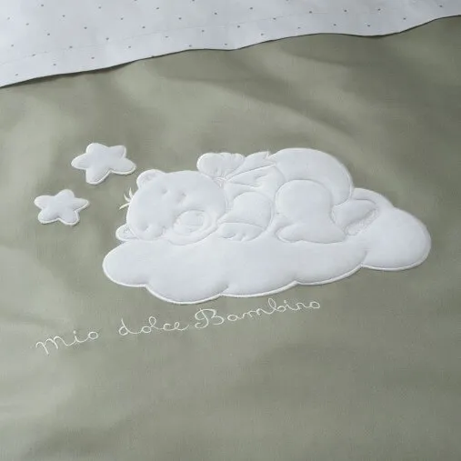 Дизайн модели Бамбино окружит вашего малыша теплом семейного уюта. Природные оттенки и спокойные тона элитного сатина убаюкивают перед сном, а стильные и абсолютно натуральные плюшевые игрушки и объемная велюровая аппликация займут маленького первооткрывателя после пробуждения.