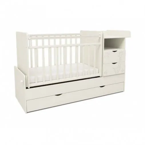 Экономичная Детская кроватка SKV Жираф с поперечным маятниковым механизмом и вместительным ящиком для хранения. Два фасада ящиков комода из МДФ, облицованные плёнкой ПВХ, с забавной фрезеровкой в виде жирафа. Пеленальный стол с ограждениями стал гораздо удобнее, за счёт увеличения размера столешницы.