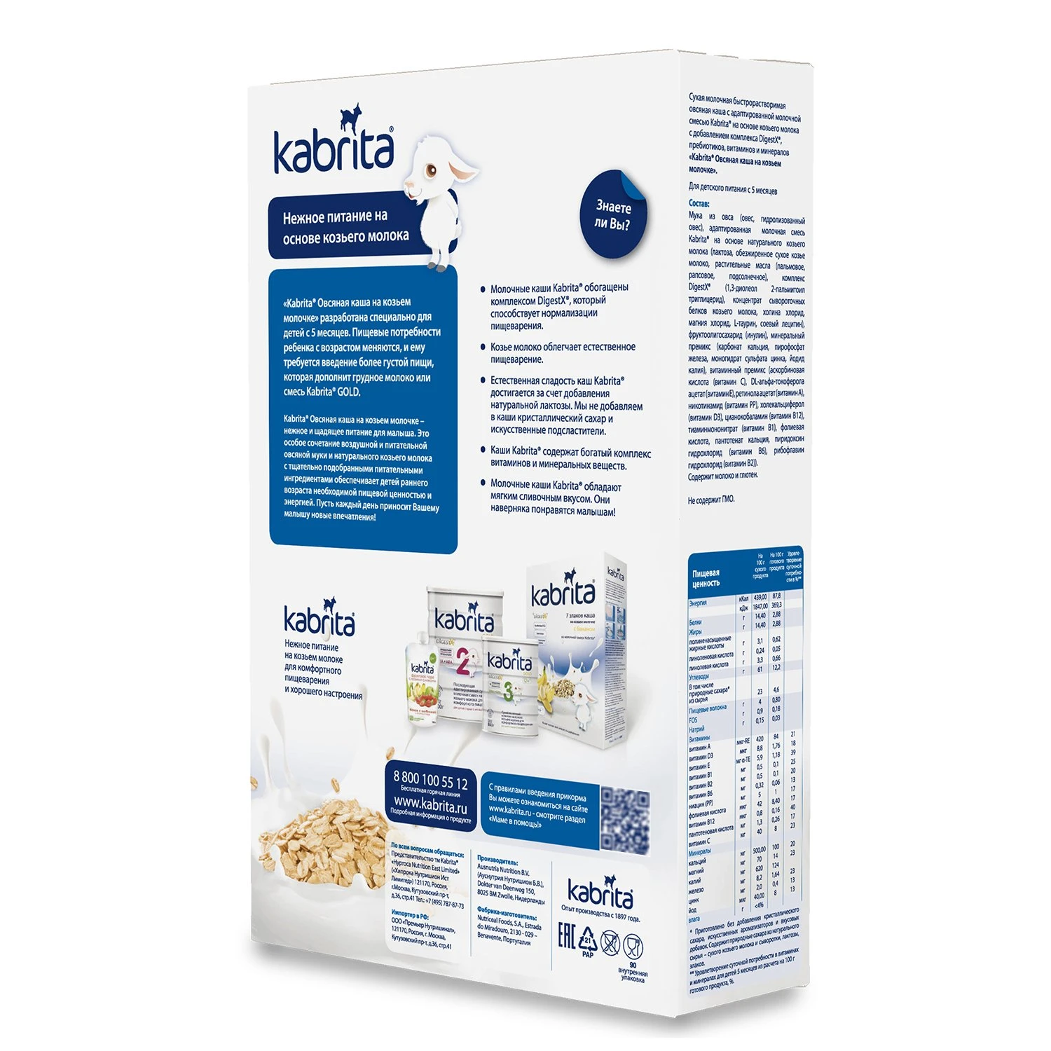 Адаптированная молочная смесь Kabrita с натуральным козьим молоком в составе каши для комфортного пищеварения. Технология "легкого расщепления зерна" облегчает пищеварение, позволяет сохранить естественную сладость зерна. Благодаря этой технологии каши Kabrita имеют воздушную, нежную структуру и идеально разводятся в воде. DigestX - жировой комплекс с бета-пальмитатом, аналогичный жировому профилю грудного молока, способствует снижению вероятности возникновения запоров, лучшему энергетическому обмену и усвоению кальция. Пребиотики способствуют улучшению пищеварения и укреплению иммунитета.