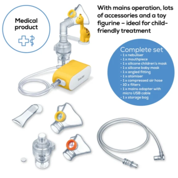 Этот прибор представляет собой ингаляционное устройство для распыления жидкостей и жидких лекарств (аэрозолей) для лечения верхних и нижних дыхательных путей. Его можно использовать у младенцев, грудничков, детей младшего возраста и взрослых. Распыление и вдыхание лекарств, назначенных или рекомендованных врачом, позволяет предотвратить респираторные заболевания, лечить их побочные эффекты и ускорить выздоровление. Прибор подходит для домашнего использования в спокойной обстановке. Ингалятор оснащен маленькой насадкой "жираф", что облегчит его использование для маленьких детей.