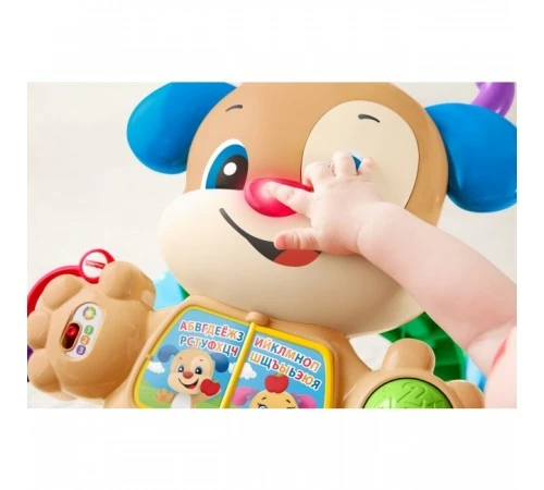 Эти веселые интерактивные ходунки в виде щенка помогут малышу сделать первые шаги. Игрушка имеет 2 режима: "Игра сидя" и "Хождение". На передней панели ходунков находятся разнообразные игровые элементы: ролик, спиннер, книжечка, которая познакомит с буквами, а также кнопки, при нажатии которых можно изучать цвета, формы и цифры. Если нажать на носик щенка - прозвучат веселые песни и поучительные фразы на русском и английском языках.