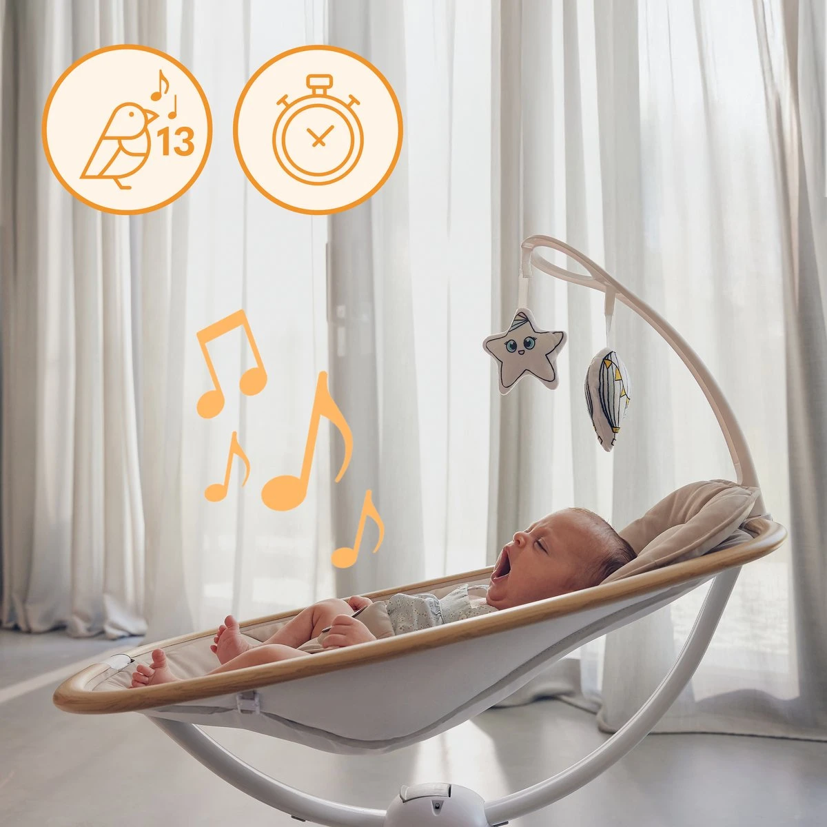 Подборка предустановленных мелодий, звуков природы и белого шума помогает успокоить малыша, обеспечивая при этом разнообразие. Встроенный таймер позволяет автоматически остановить укачивание через выбранное время.