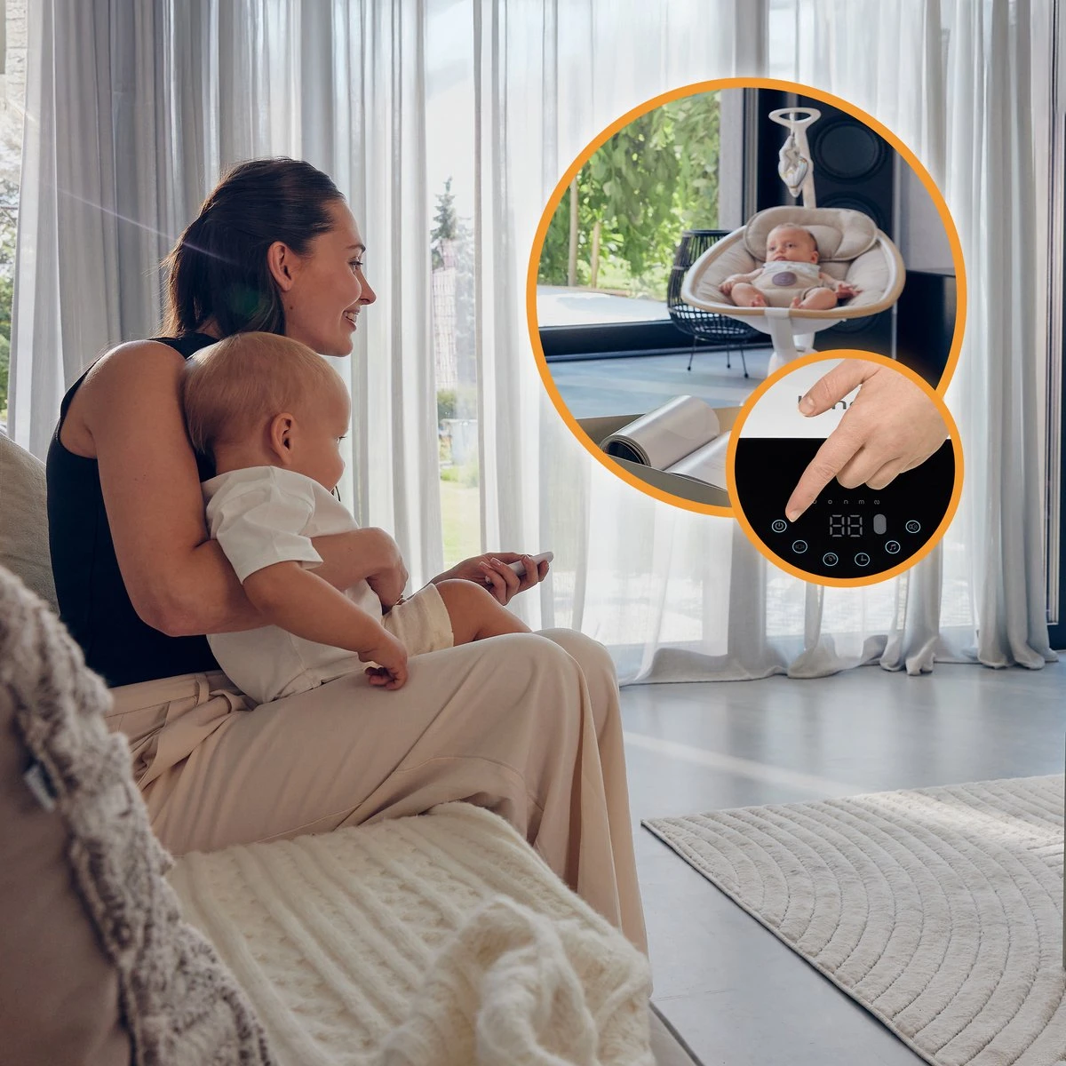 Сиденье поворачивается на 180°, что позволяет изменить направление укачивания и легко установить зрительный контакт между ребенком и родителем без необходимости переставлять качалку. Для дополнительного удобства качалкой можно управлять дистанционно с помощью прилагаемого пульта. Съемный и моющийся чехол обеспечивает легкий уход. Olivia спроектирована для удобного дистанционного управления и предлагает несколько направлений укачивания.