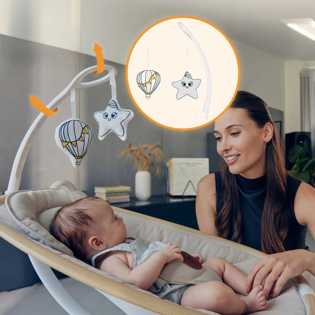 Сиденье поворачивается на 180°, обеспечивая прямой зрительный контакт между малышом и родителем. Это способствует чувству безопасности и спокойствия. Эта функция также изменяет направление укачивания, удерживая внимание ребенка.