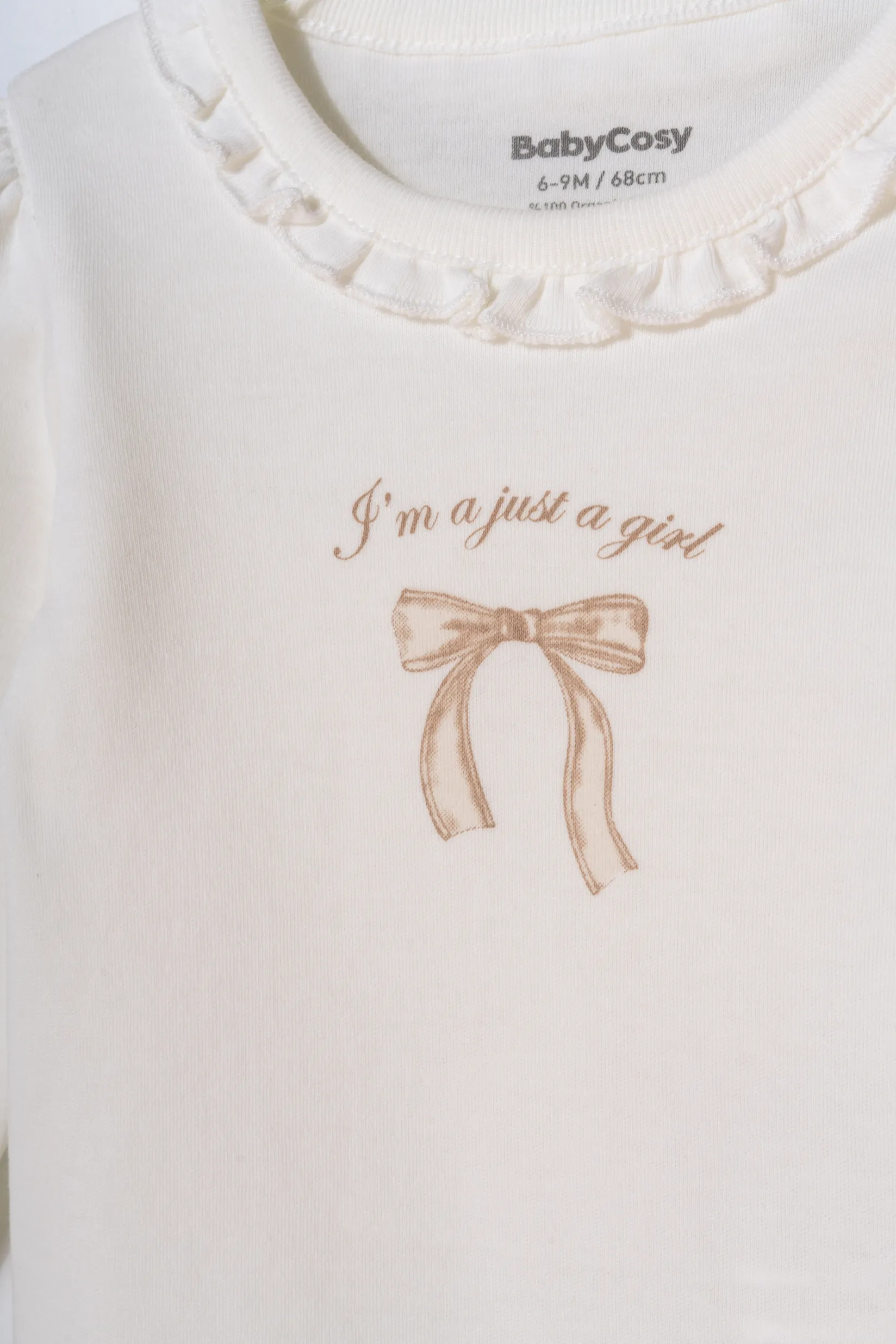 Набор боди BabyCosy Ecru & Ivory создан для ежедневного комфорта вашей девочки. Оба боди выполнены в нежных оттенках экрю и айвори: одно украшено дизайном с маленькими повязками, а другое — большой повязкой с надписью «I’m just a girl». Система застежек-кнопок между ножками и на плече обеспечивает легкость при одевании и переодевании.