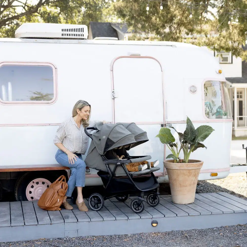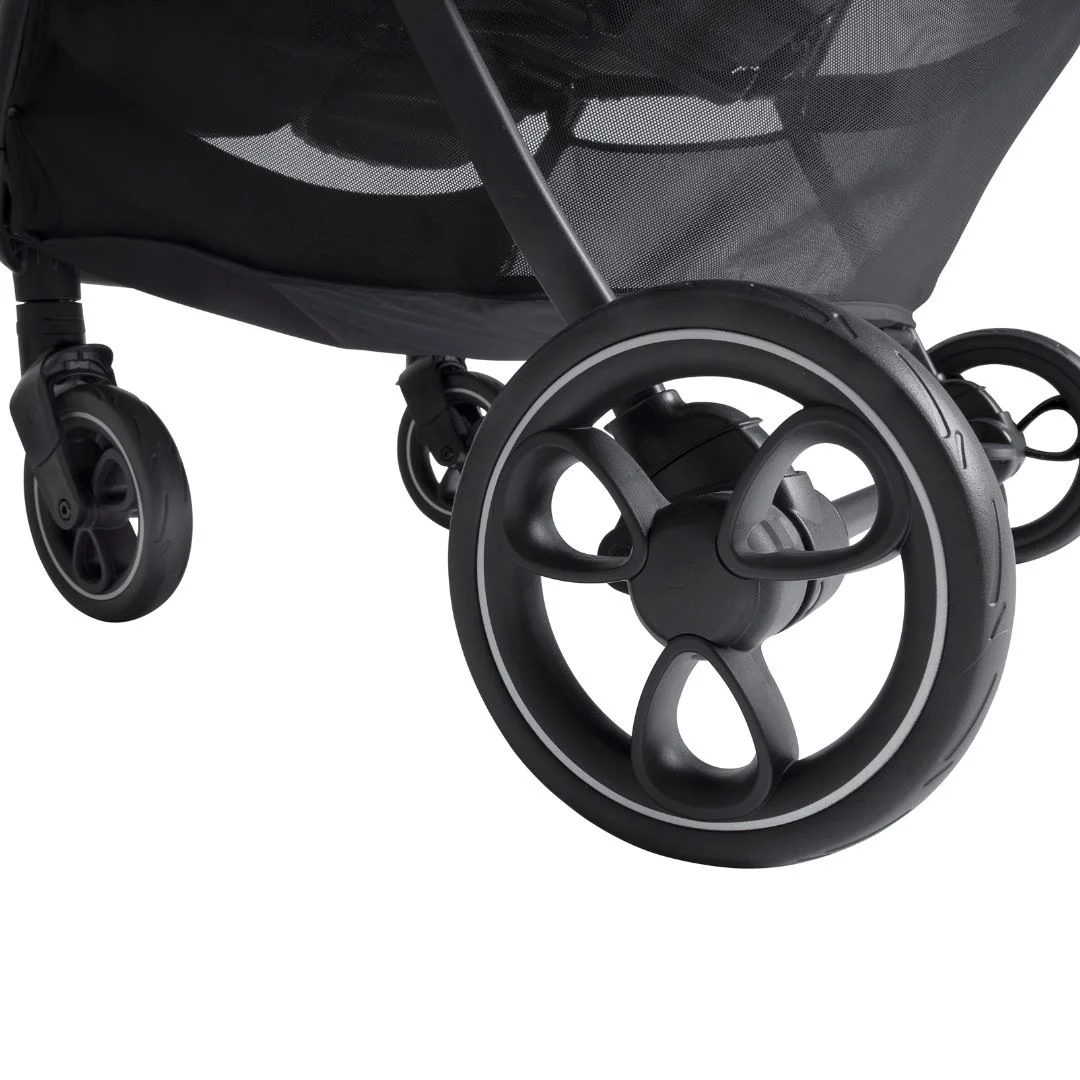Компактное складывание — механизм складывания одной рукой превращает эту двухместную коляску deluxe в компактную конструкцию для хранения.