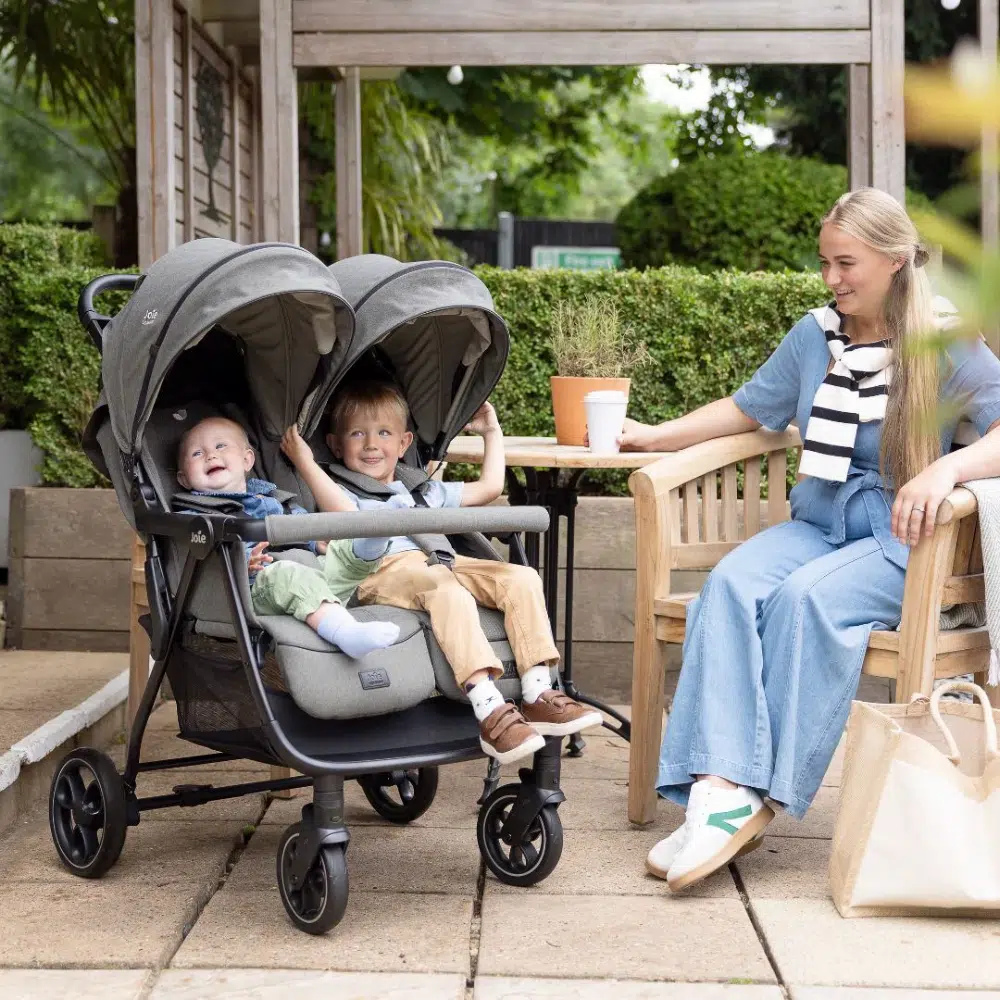 Лёгкая двухместная коляска класса deluxe с двумя настраиваемыми сиденьями для прогулок с малышами, которые хотят всё по-своему.