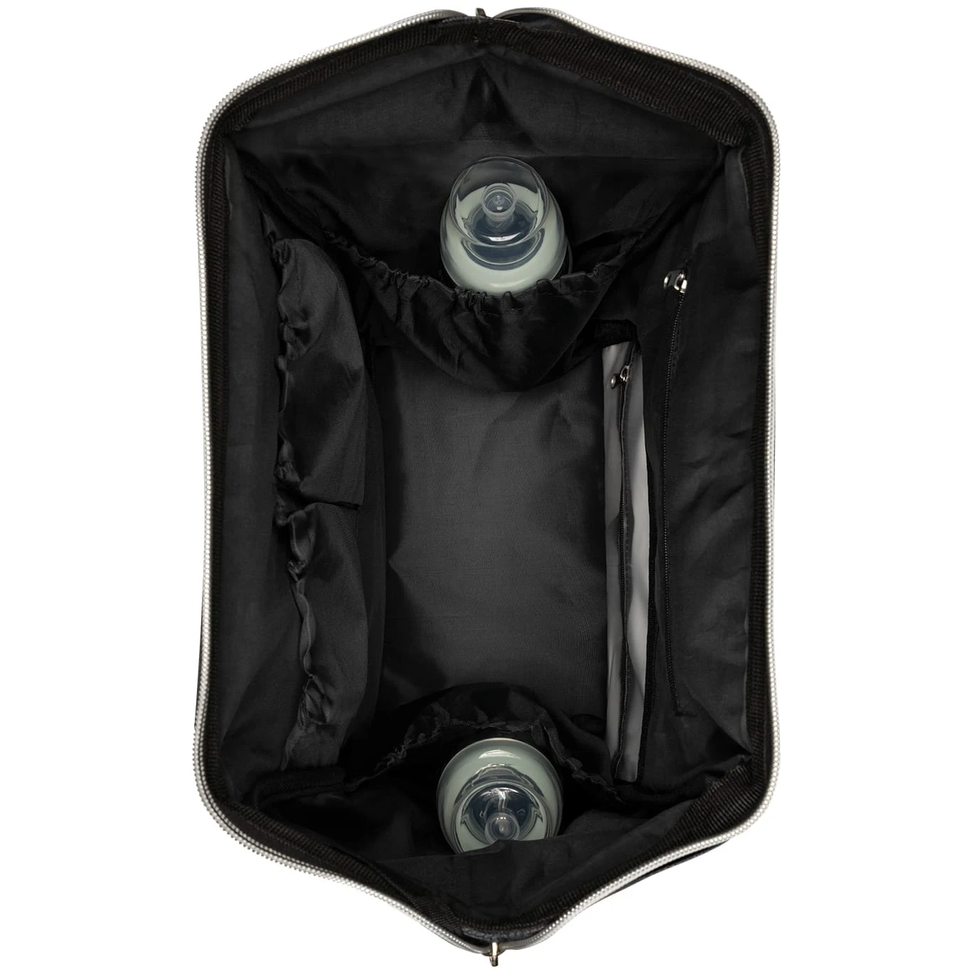 - Основной карман открывается широко с поддерживающей металлической рамкой, что облегчает доступ, а специализированные карманы позволяют организовать все необходимое для современных родителей.