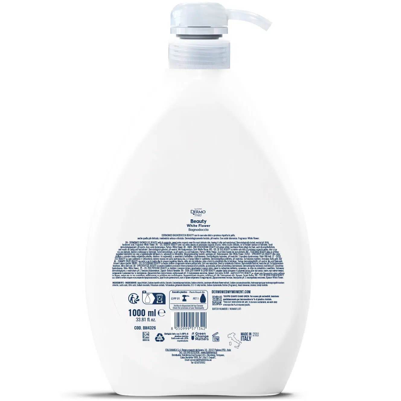 Гель для душа Dermomed Beauty с белыми цветами обладает увлажняющим действием, благодаря содержанию гиалуроновой кислоты и глицерина, которые смягчают и защищают кожу.