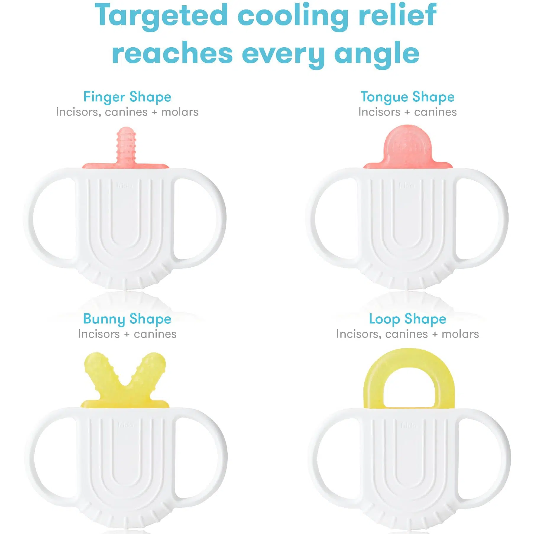 - МНОГОСТОРОННИЙ: Две двусторонние вставки с четырьмя разными формами охлаждают все новые зубки и обеспечивают облегчение при прорезывании.