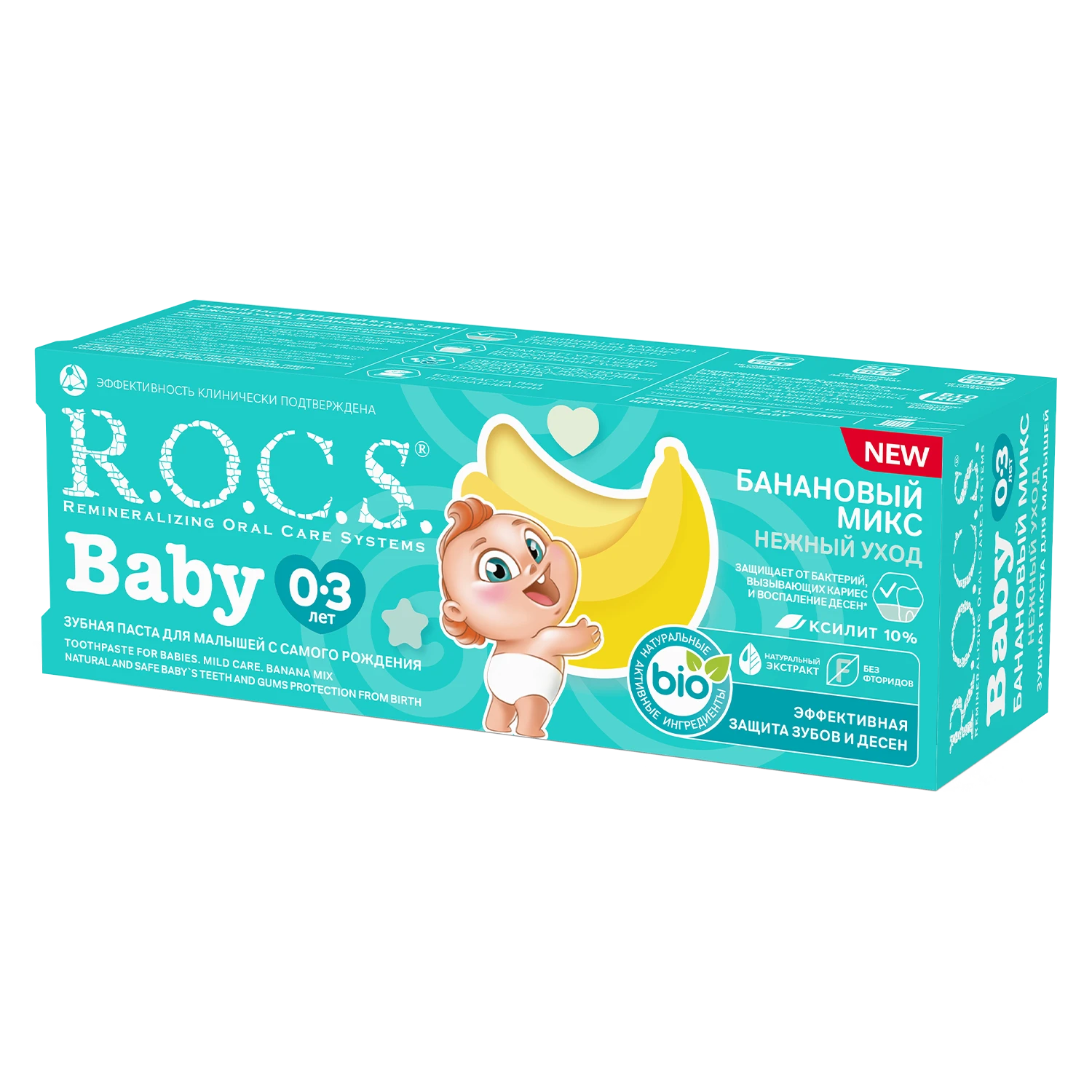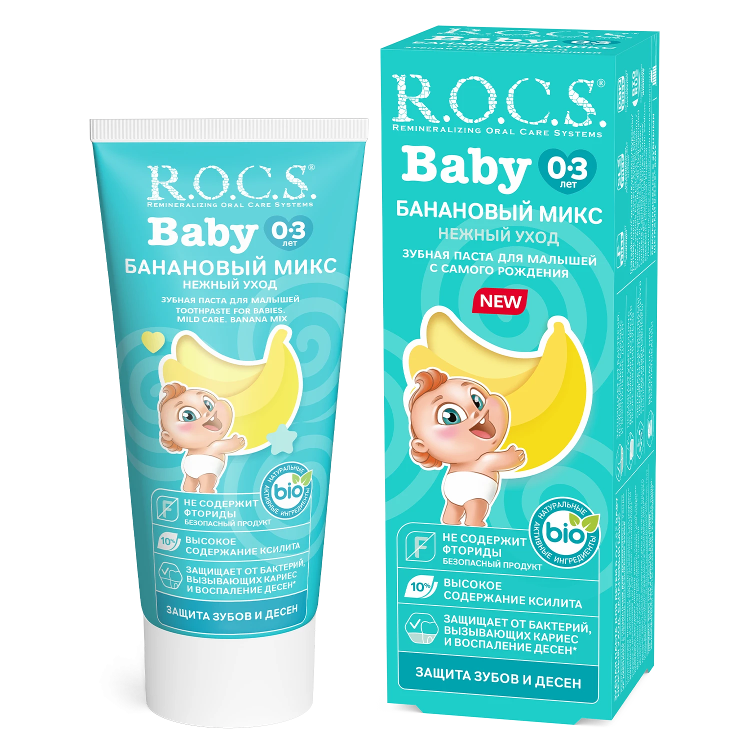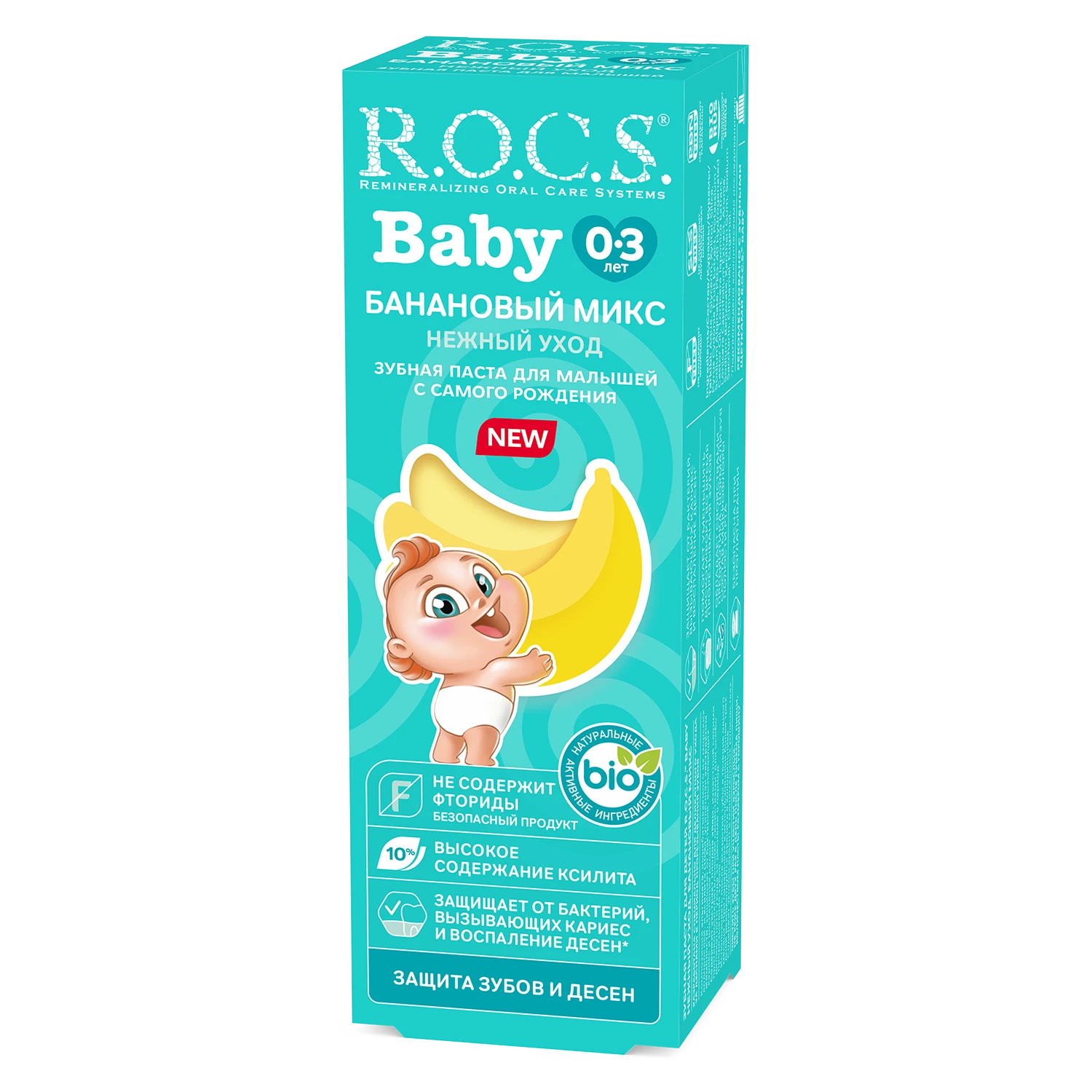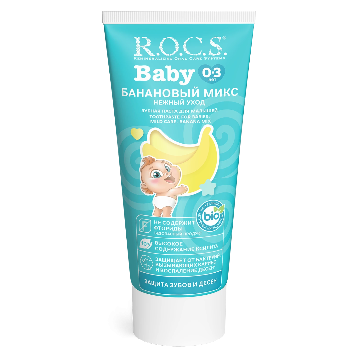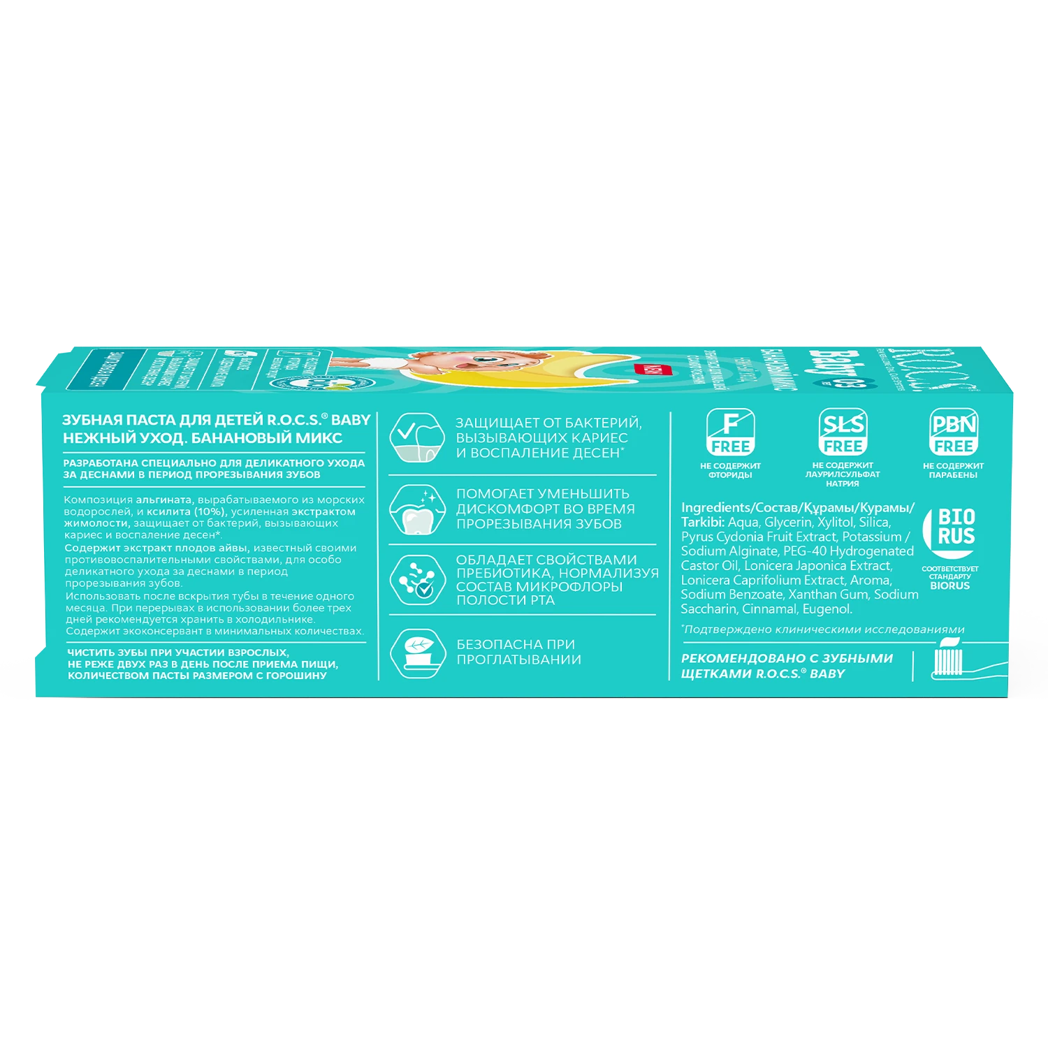 Зубная паста R.O.C.S. Baby «Нежный уход. Банановый микс» разработана специально для деликатного ухода за полостью рта малышей с самого рождения — от 0 до 3 лет!