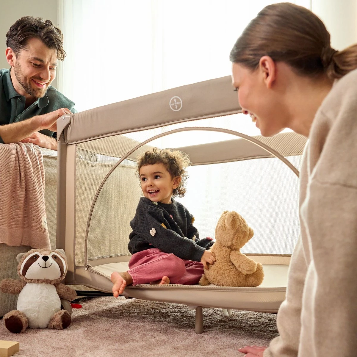 Растёт вместе с ребёнком, так как позволяет регулировать уровень матраса из пеноматериала, когда малыш немного подрастёт. На длинной стороне есть дополнительный вход, а через сетчатые стенки родители и ребёнок могут постоянно видеть друг друга. Это мобильная и лёгкая кроватка для тех, кто использует каждый сантиметр пространства.