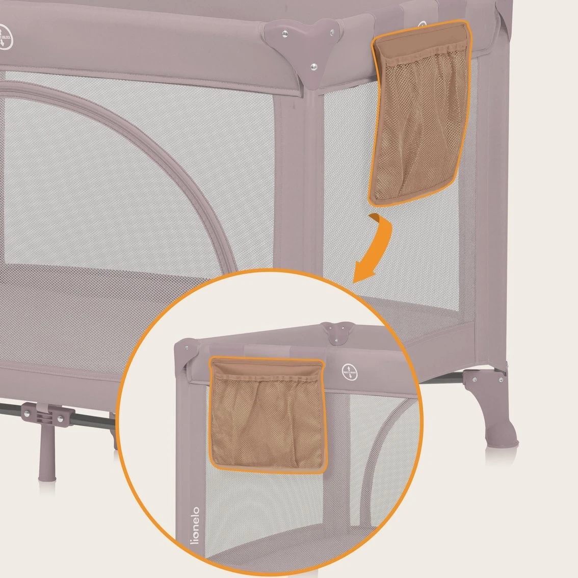 Вмещает игрушки или аксессуары, и его можно установить с любой стороны кроватки! Благодаря этому кроватка подстраивается под пространство (например, если стоит в углу, карман можно переместить на свободную сторону).