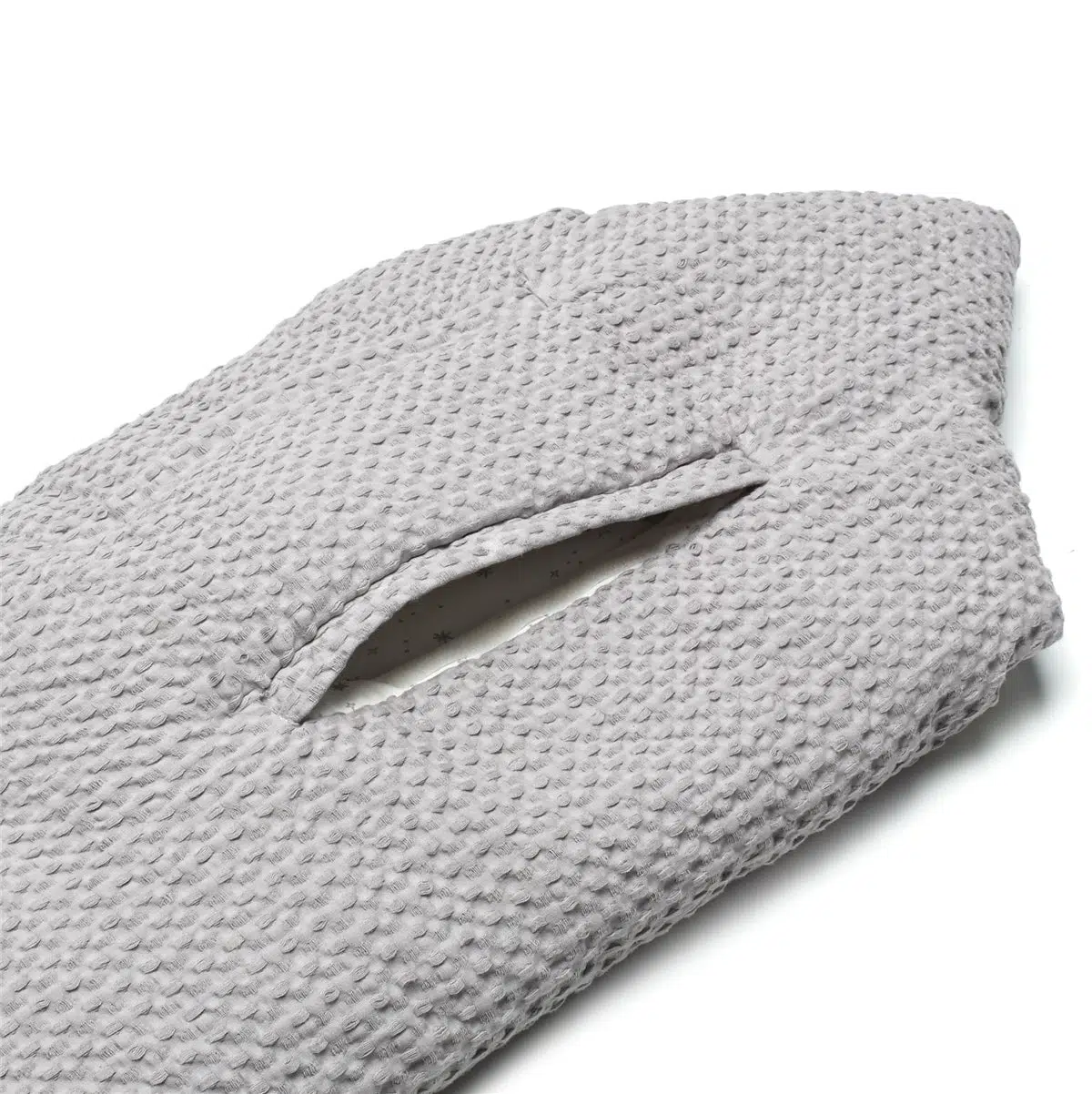 Оснащён кнопками для бокового открытия и молнией в области ног, чтобы ребёнок не раскрывался и/или чтобы внутрь не проникал воздух.