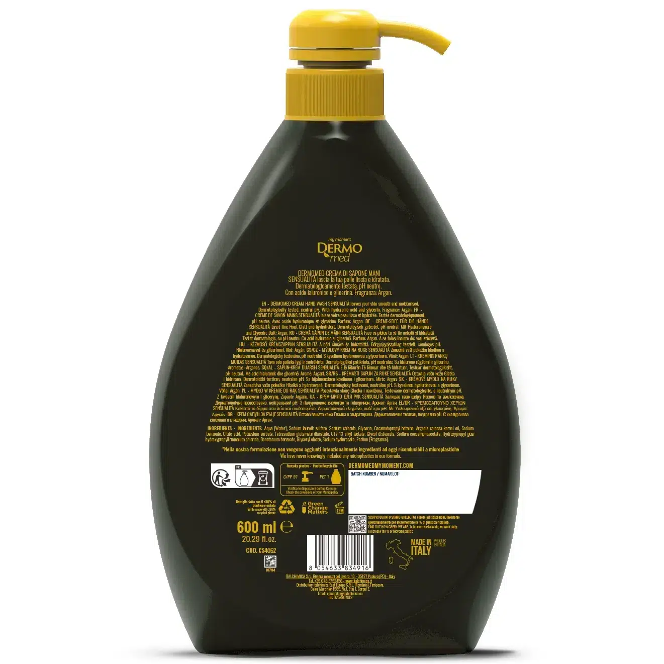 Жидкое мыло для рук Dermomed Sensualità содержит гиалуроновую кислоту и глицерин с смягчающими, увлажняющими и восстанавливающими свойствами для дермы.