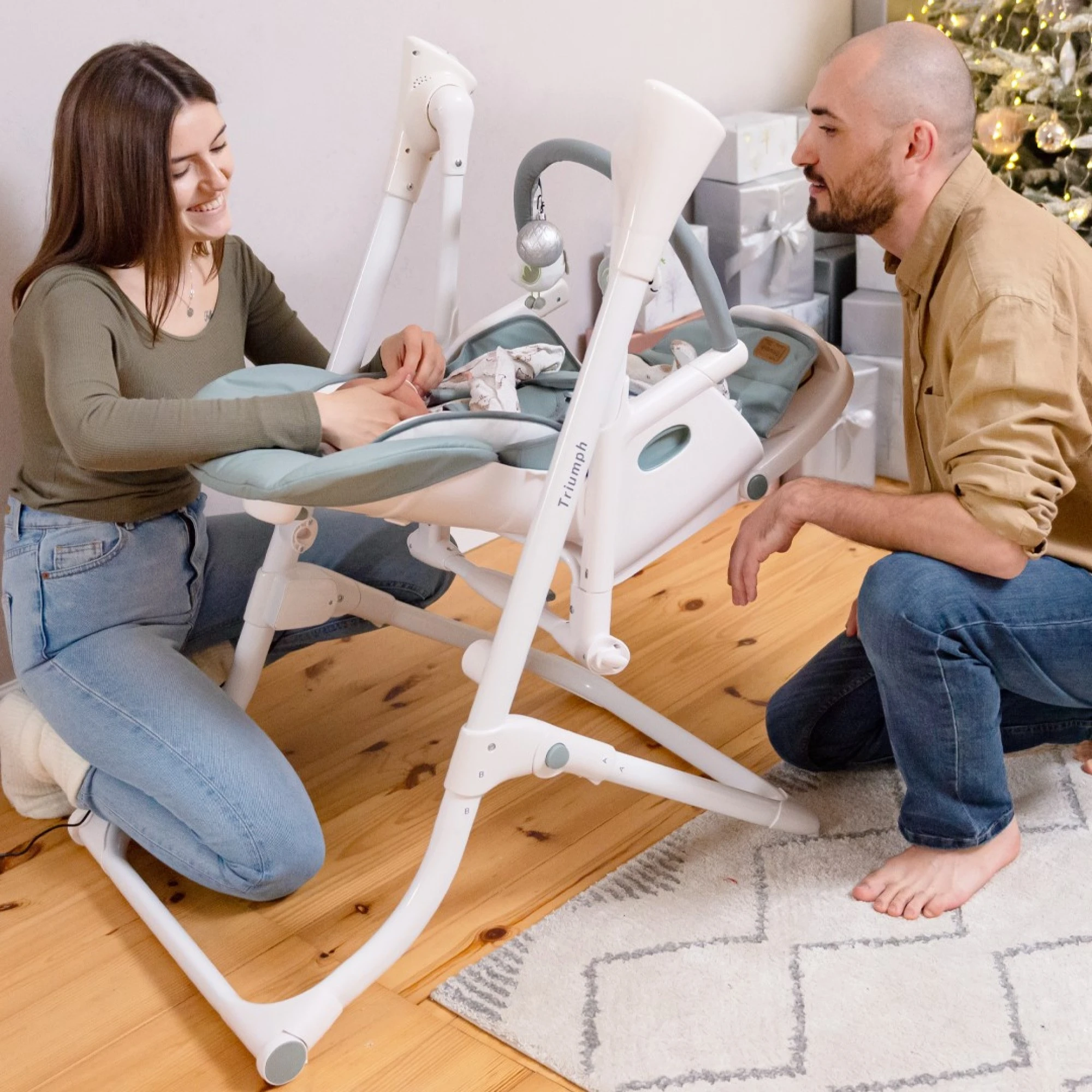 В режиме качели Triumph работает как от сети, так и от обычных пальчиковых батареек. Столешницу можно заменить дугой с мягкими игрушками.
