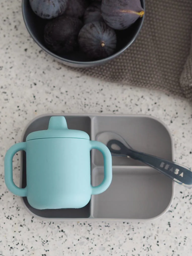 Набор силиконовой посуды от французского бренда BEABA состоит из большой трехсоставной тарелки-миски, чашки с двумя ручками и крышкой с мундштуком и учебной ложки. Все элементы набора отличаются эргономичной округлой формой и мягкими ровными краями. Разделение тарелки на три части (150 мл + 90 мл + 90 мл) позволяет разделить еду на порции, что поможет малышу научиться есть самостоятельно и правильно составлять блюда. Более высокие бортики помогают малышу зачерпывать еду самостоятельно. Блюдо имеет на дне нескользящую присоску, благодаря которой оно устойчиво и хорошо прилипает к столу. Чашка имеет две удобные ручки и крышку с удобным мундштуком, который можно снять, когда ребенок лучше освоит искусство самостоятельного питья. Ложка идеально адаптируется ко рту ребенка и ее можно положить так, чтобы головка не касалась поверхности, благодаря чему ее использование намного более гигиенично.
